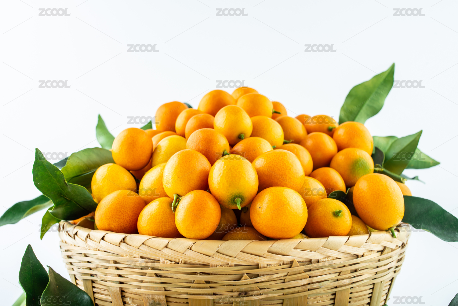 白背景上竹篮装满新鲜金桔
