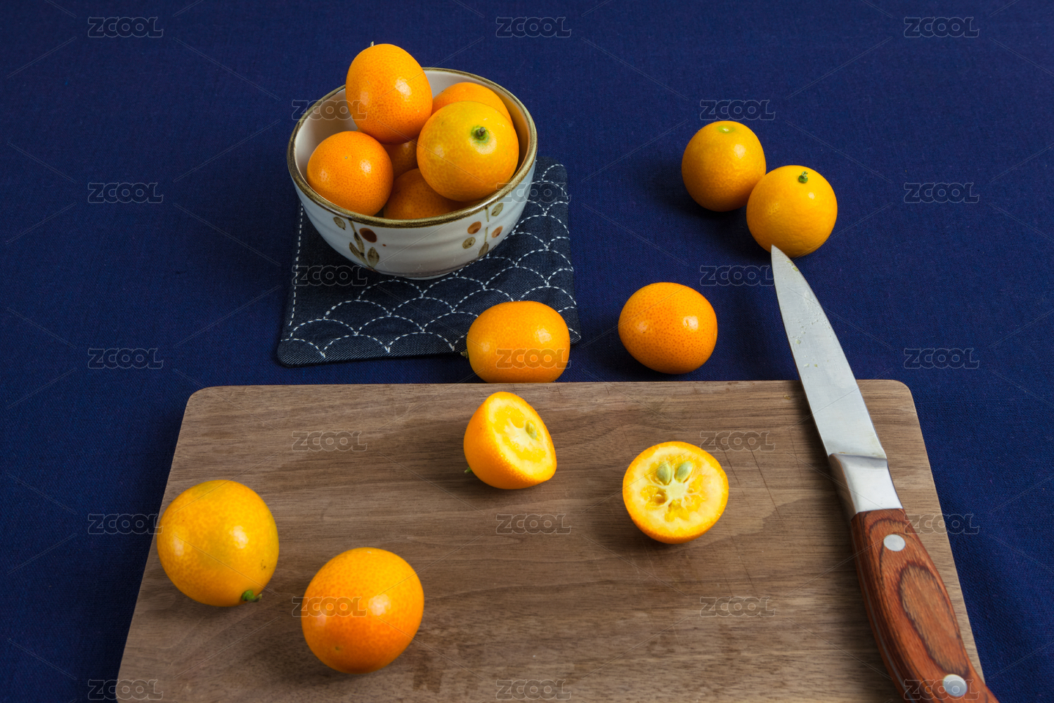 白底上平方着的三个金桔和两个切开的金桔