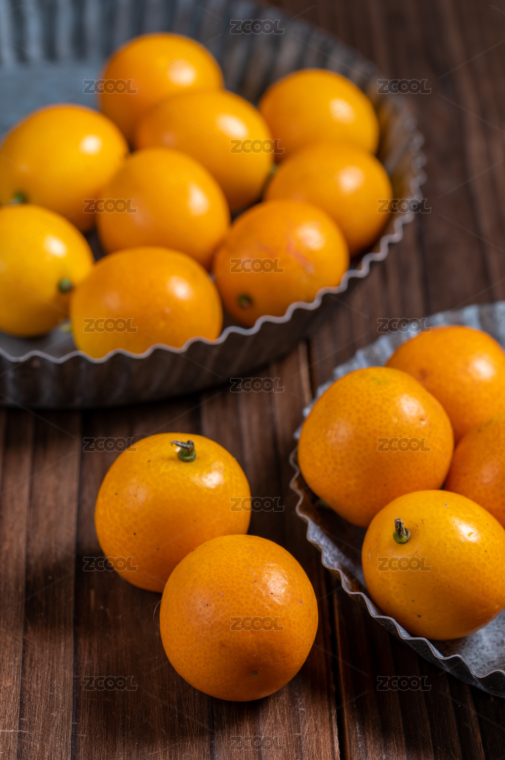 木纹桌上铁盘里的新鲜小金桔