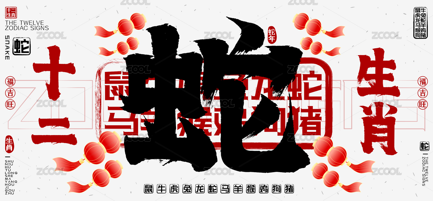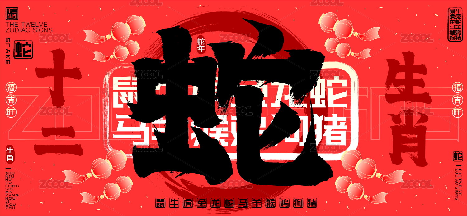 蛇十二生肖喜庆灯笼水墨中国风矢量书法字