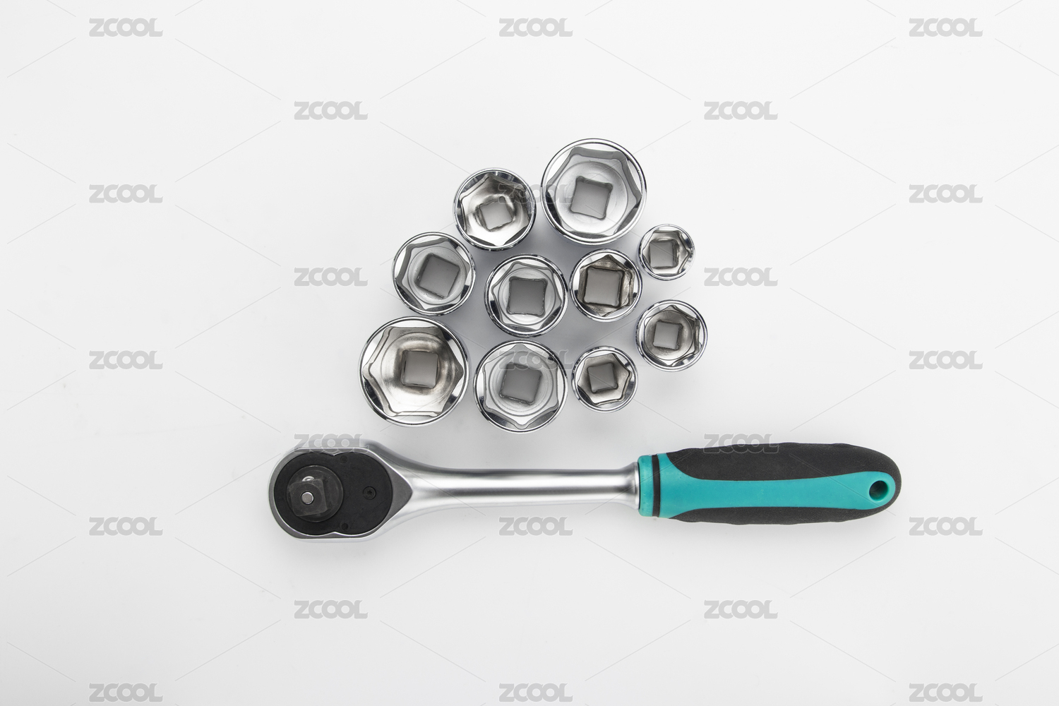 白色背景中的五金工具扳手和套筒