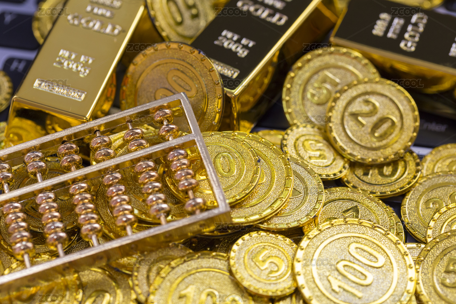 黄金金币与灰色背景金融类静物特写