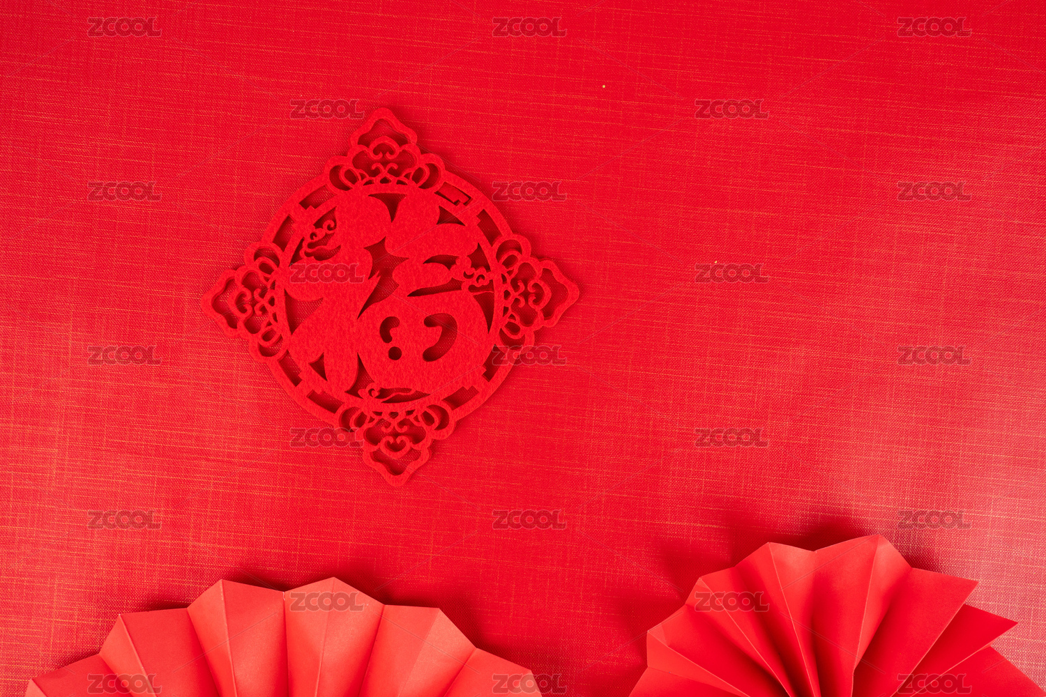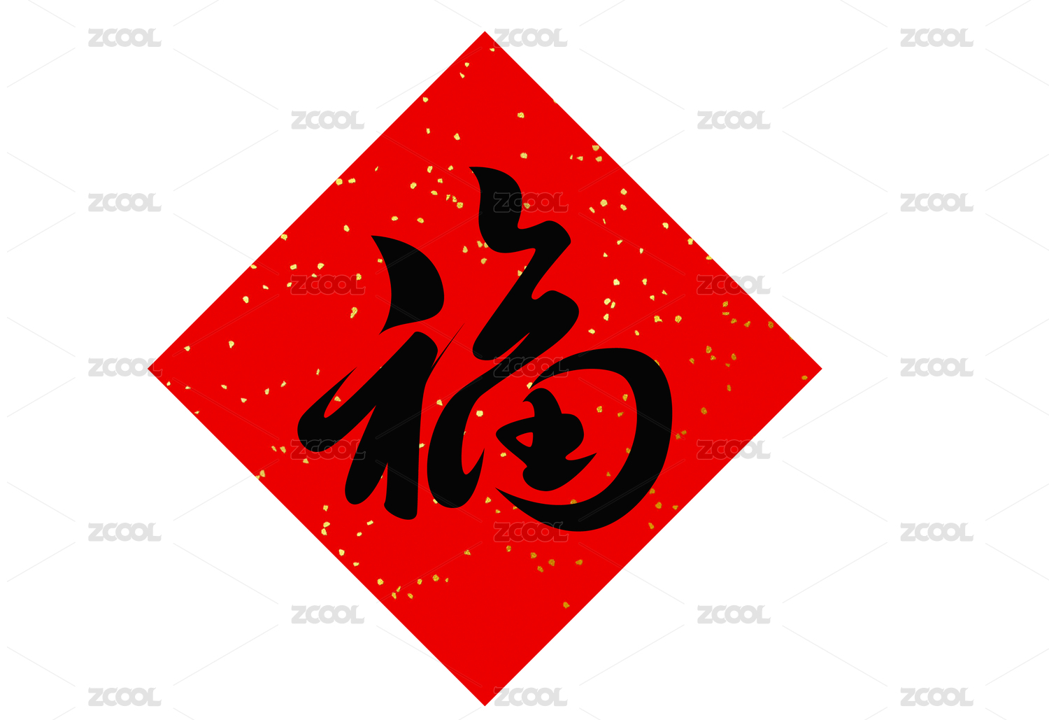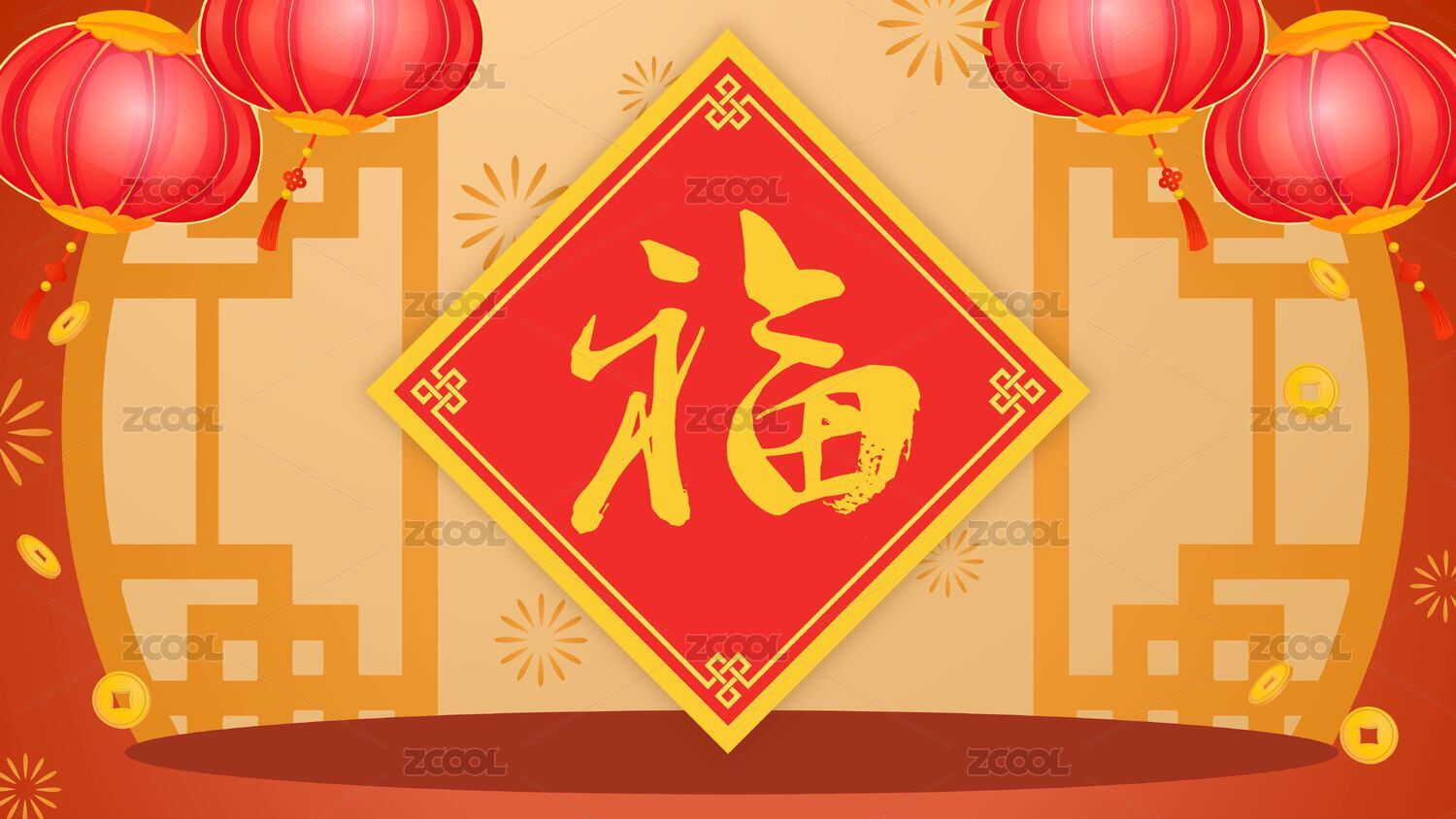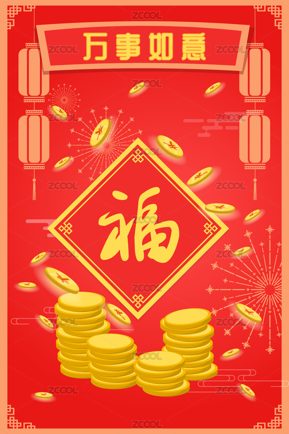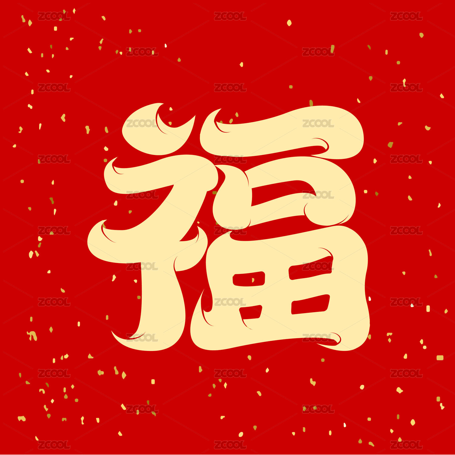 中国传统新年福字设计,米黄色背景上红色祥云和花纹图案