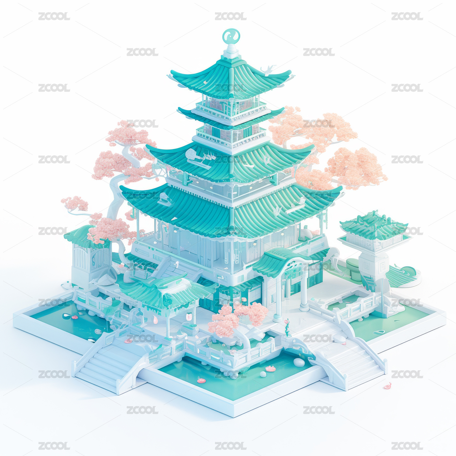 白色背景中3D立体中国风亭台楼阁UI图标