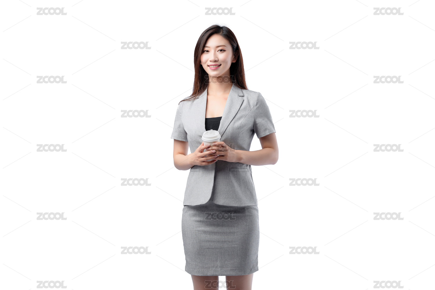 白色背景里,手拿奶茶杯的亚洲商务女士