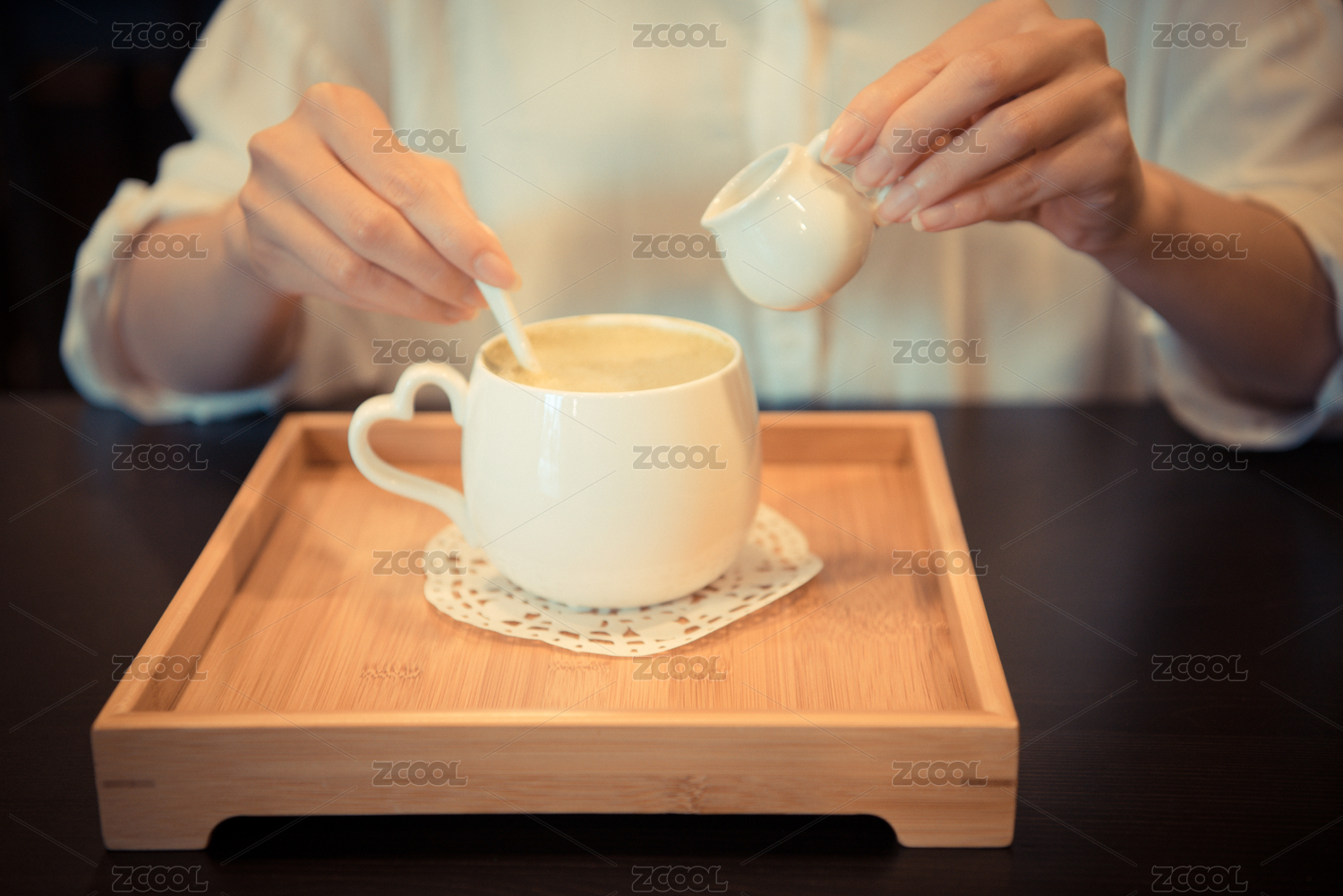 女人的手的特写照片在咖啡馆酒吧餐厅的木桌上把牛奶或奶油热咖啡一杯老式复古胶片色彩。
