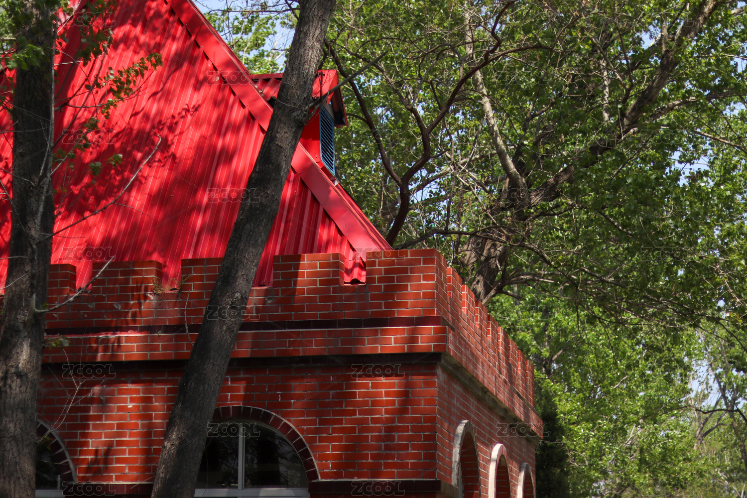 红顶红砖建筑与绿树