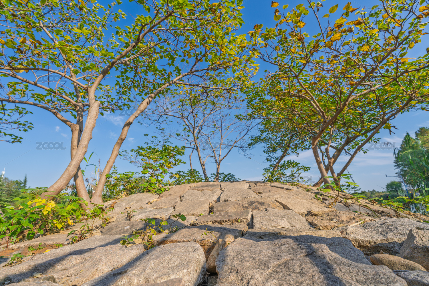 蓝天绿树环绕山石景观
