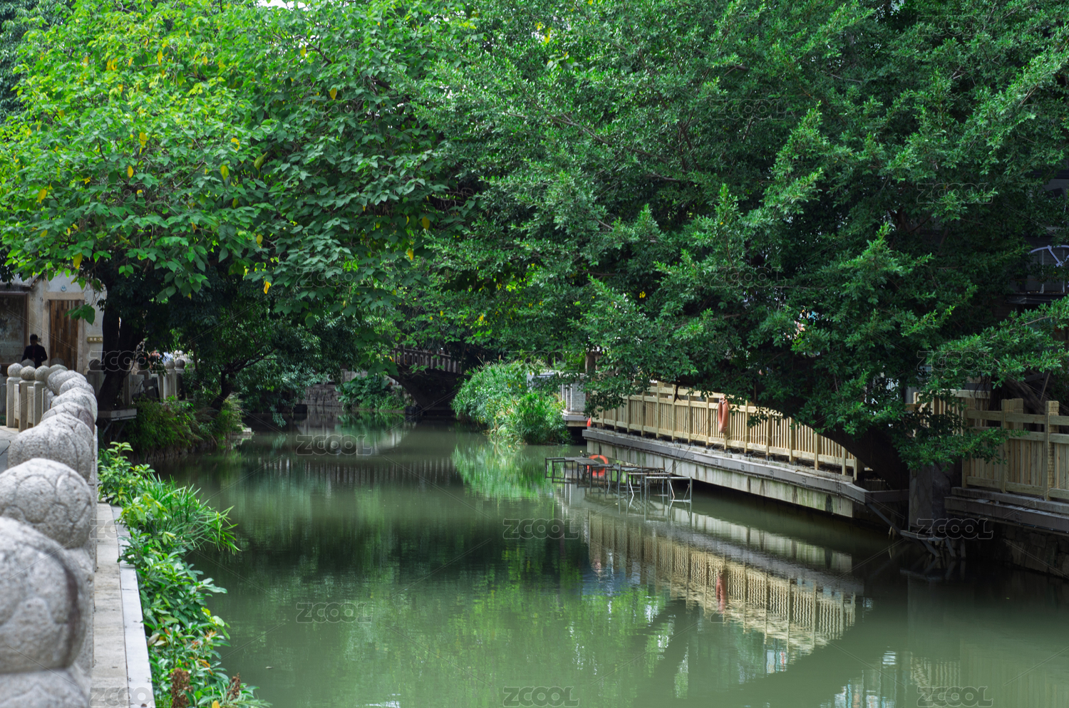 福州上下杭景区绿树环绕的静谧河道景观