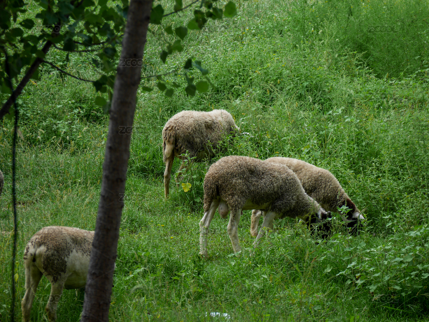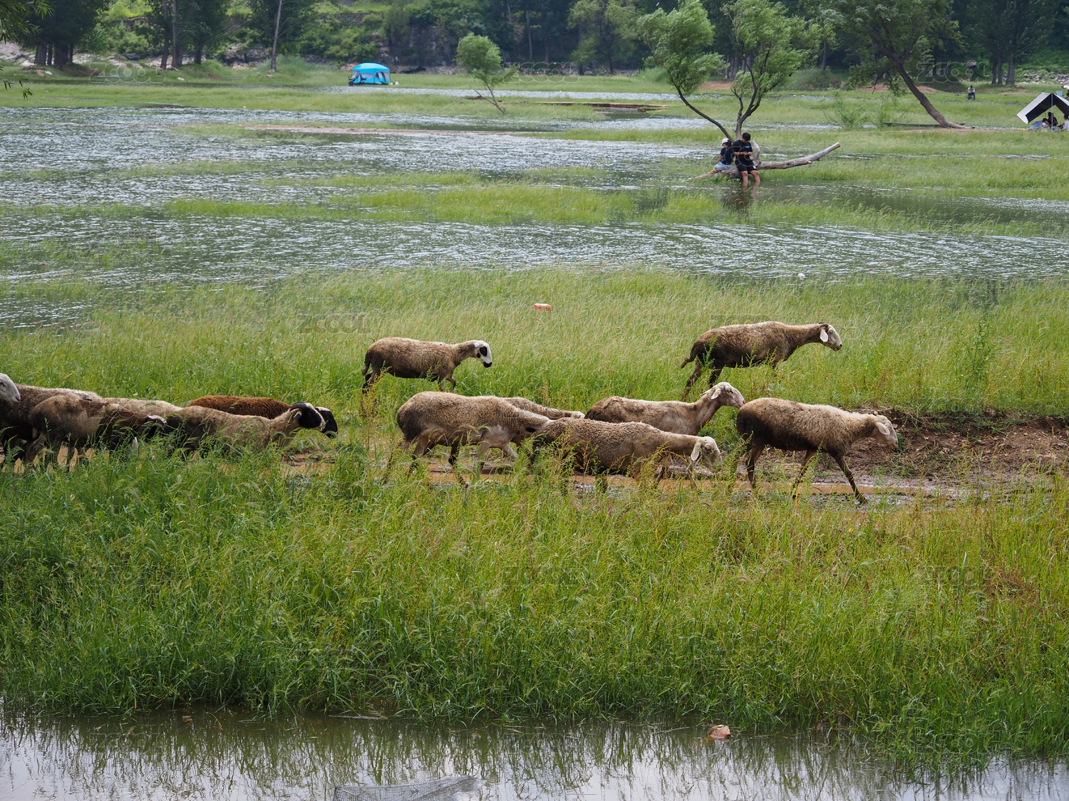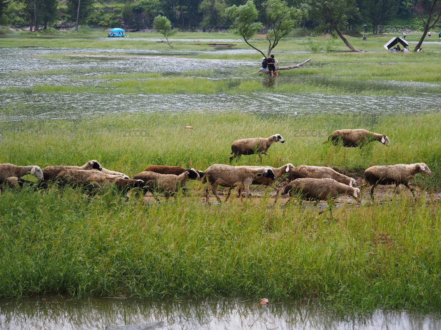 淄博沂源田庄水库边上悠闲吃草的绵羊群