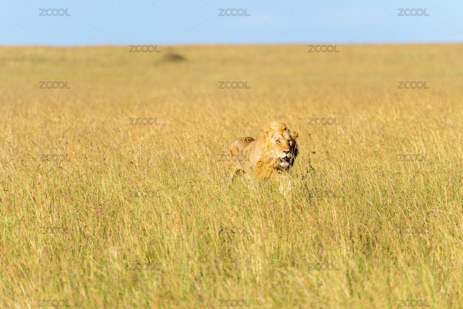 侧面拍摄 非洲狮子行走在无边无际的大草原上