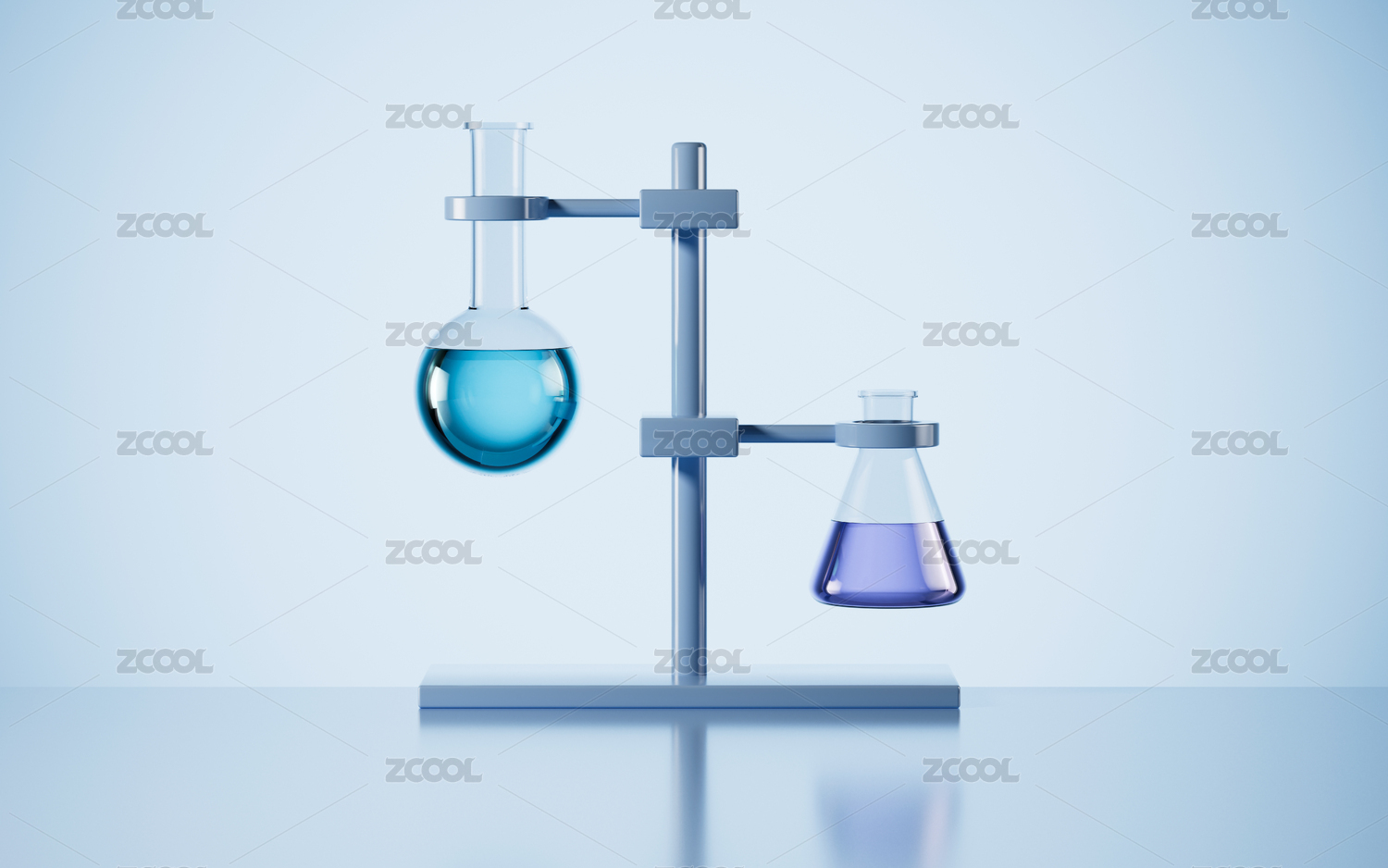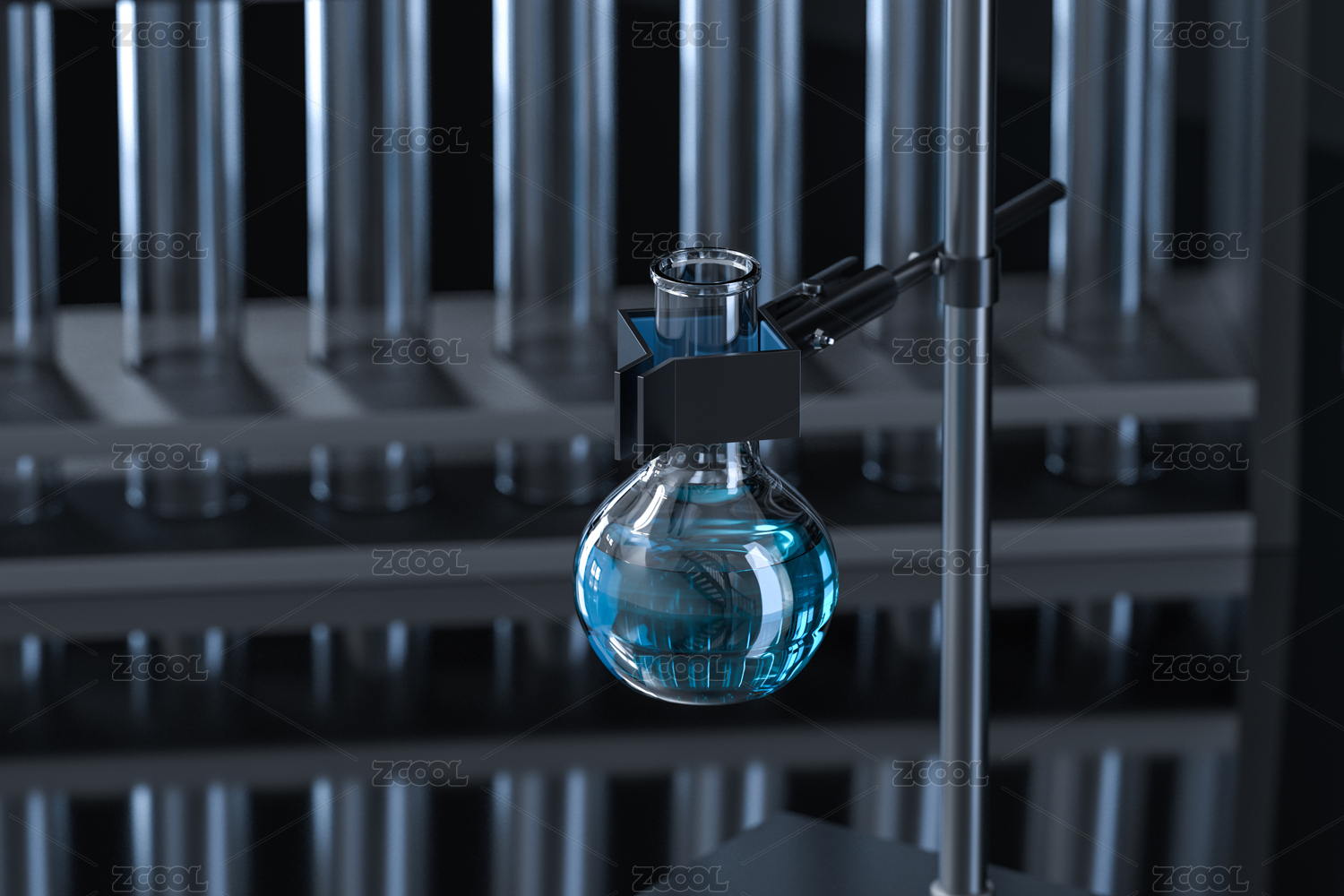 化学仪器烧瓶与飞舞的蓝色液体,三维渲染