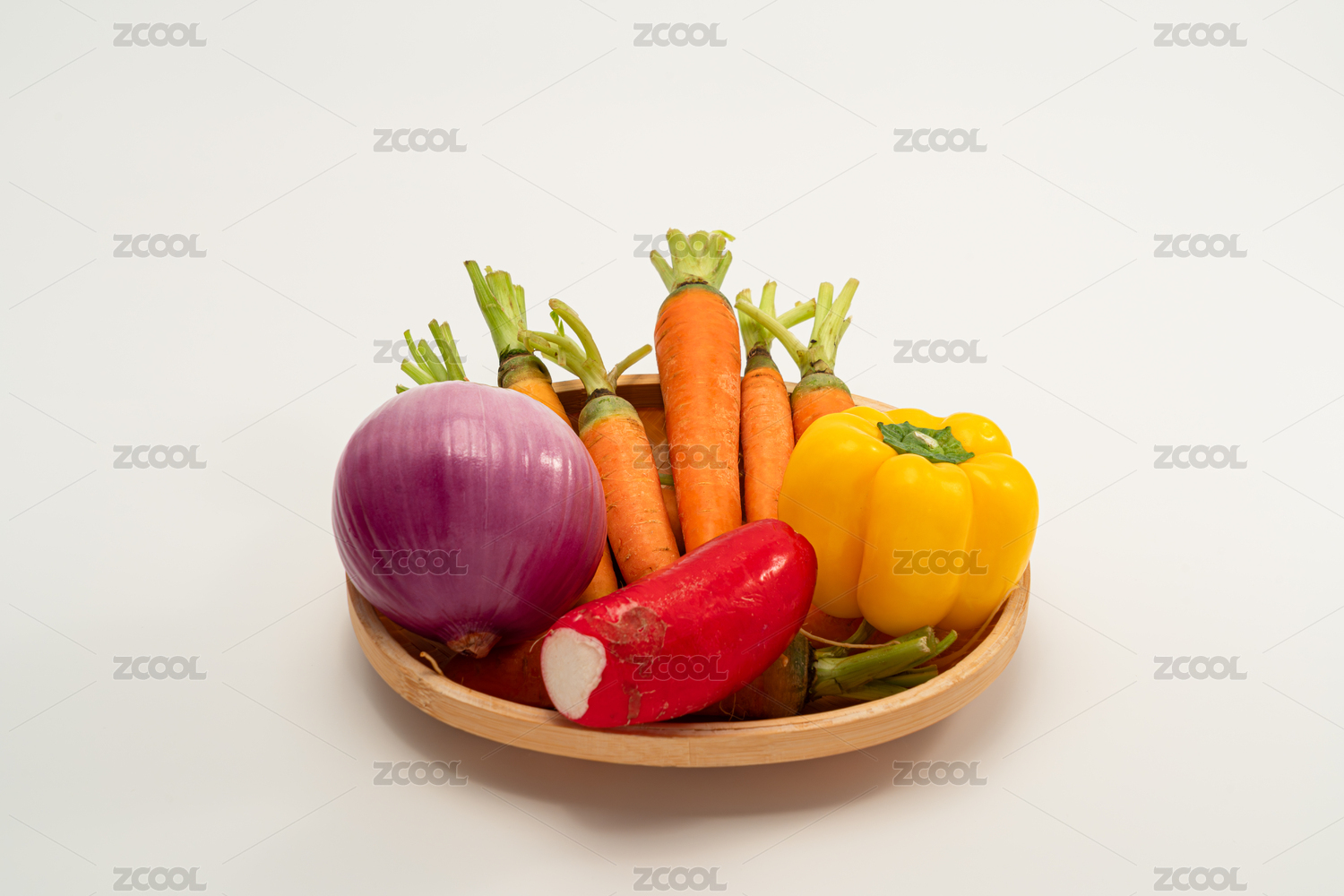 篮子里的新鲜蔬菜:胡萝卜、彩椒、洋葱、红