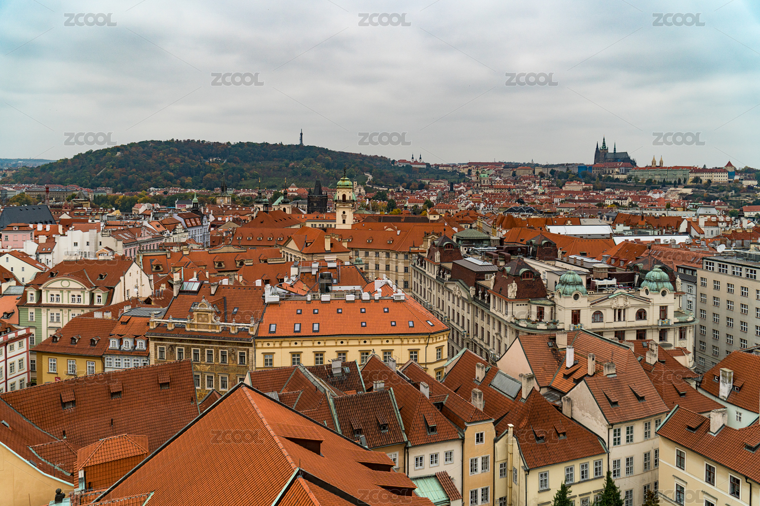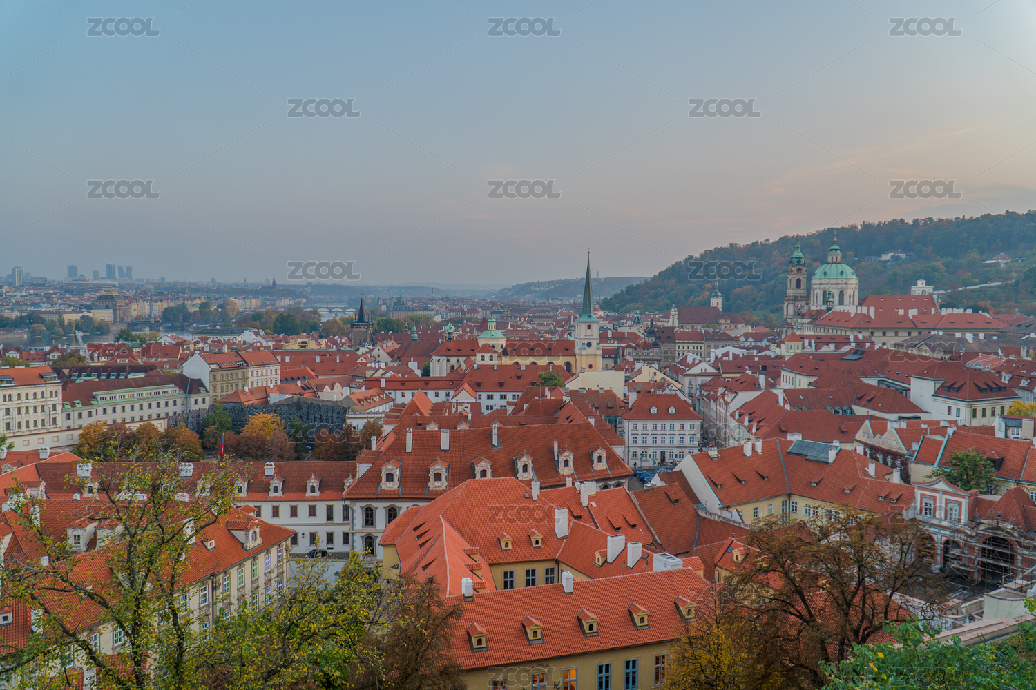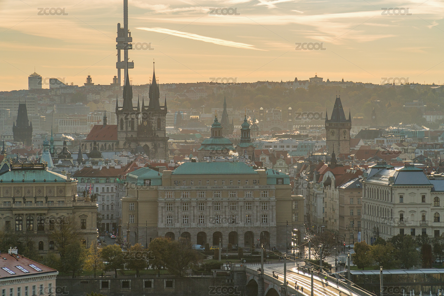 欧洲捷克布拉格旧城广场城市夕阳局部全景