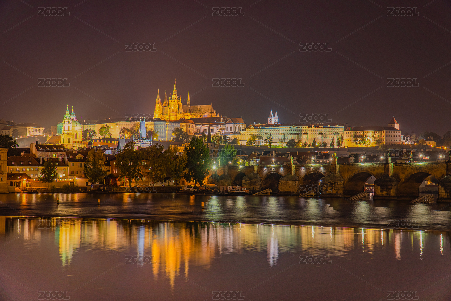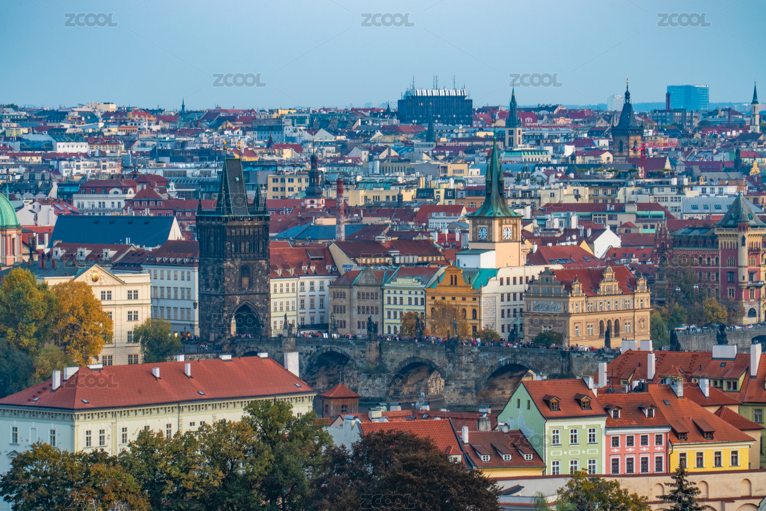 欧洲捷克布拉查理大桥边钟楼伏尔塔瓦河黄昏