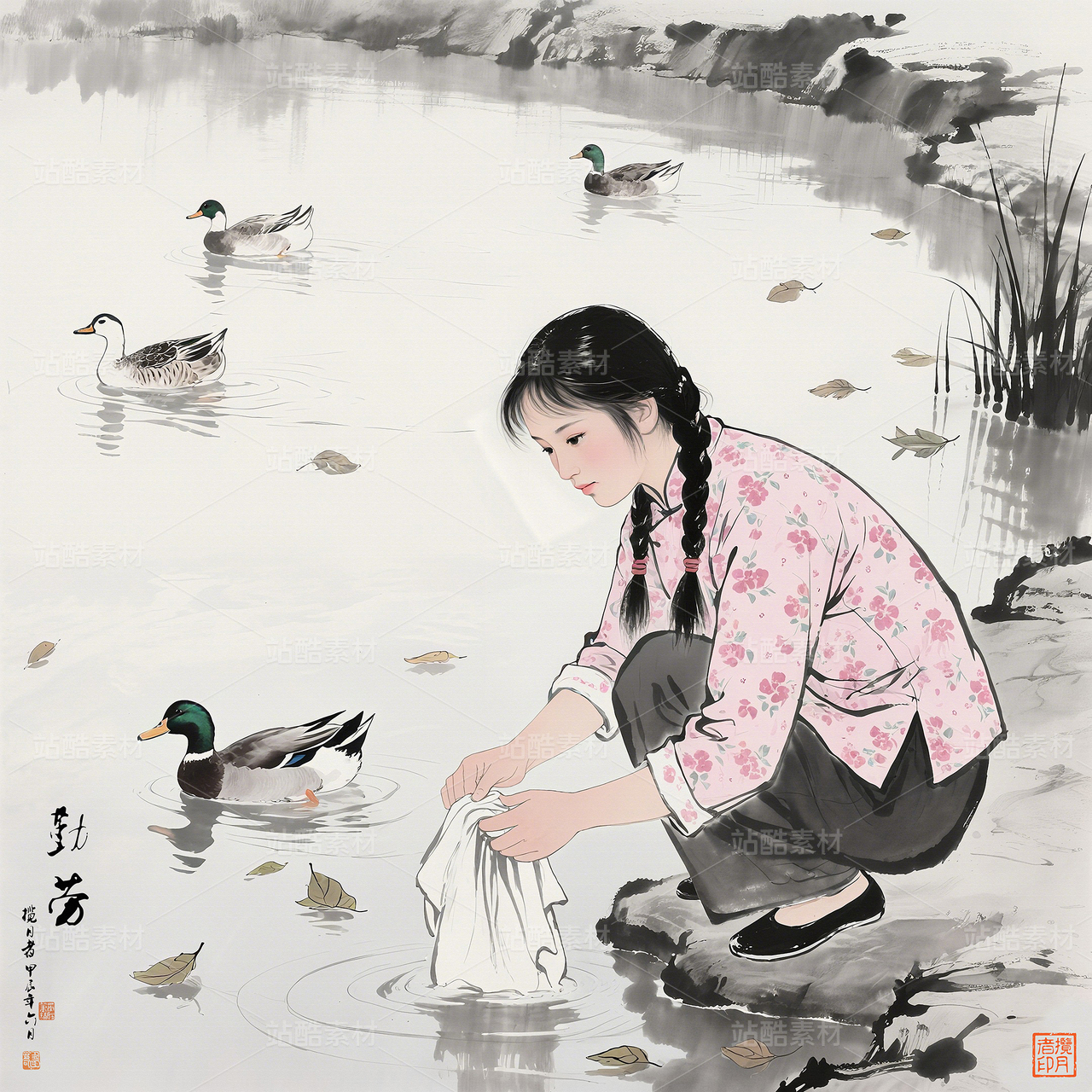 国画水墨人物画江南风景画水墨人物画水墨江南水乡山乡