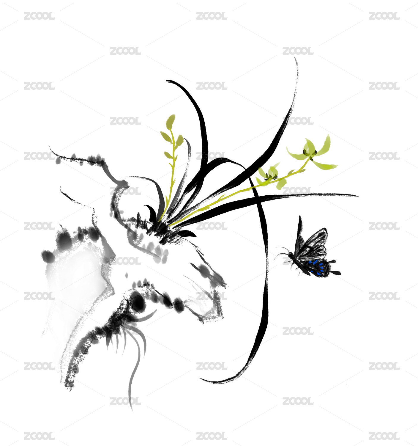 石头兰花水墨画