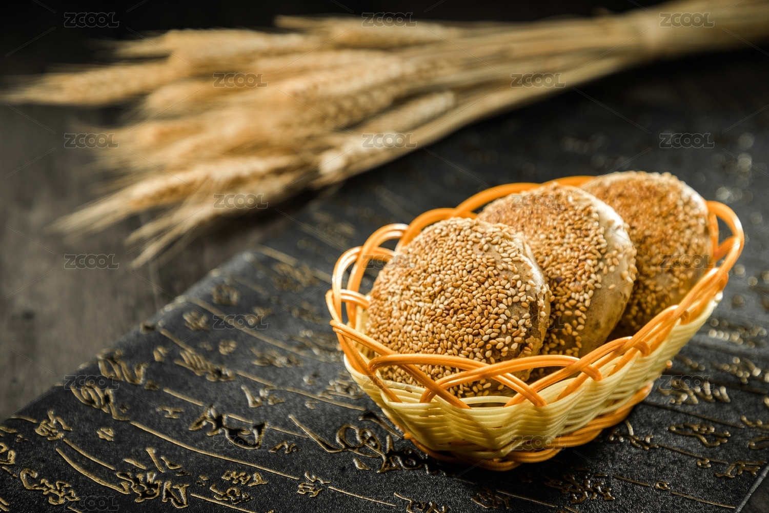 带有汉字的餐布上放着一篮芝麻酱烧饼