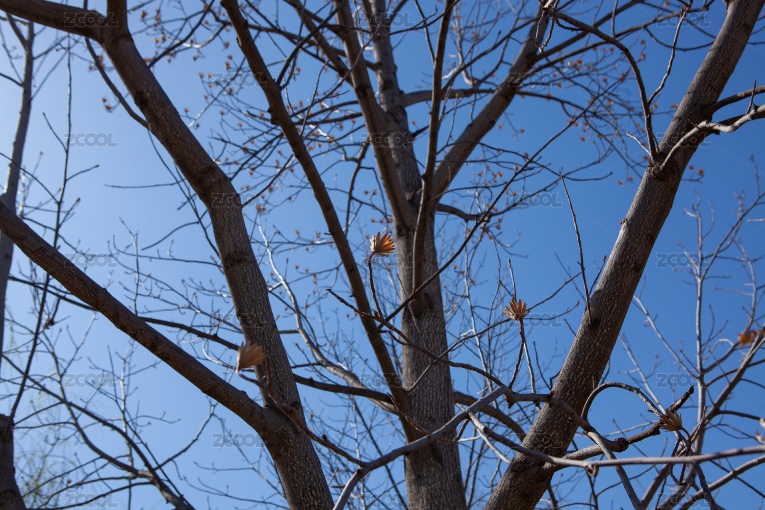 早春蓝天白云下的树木