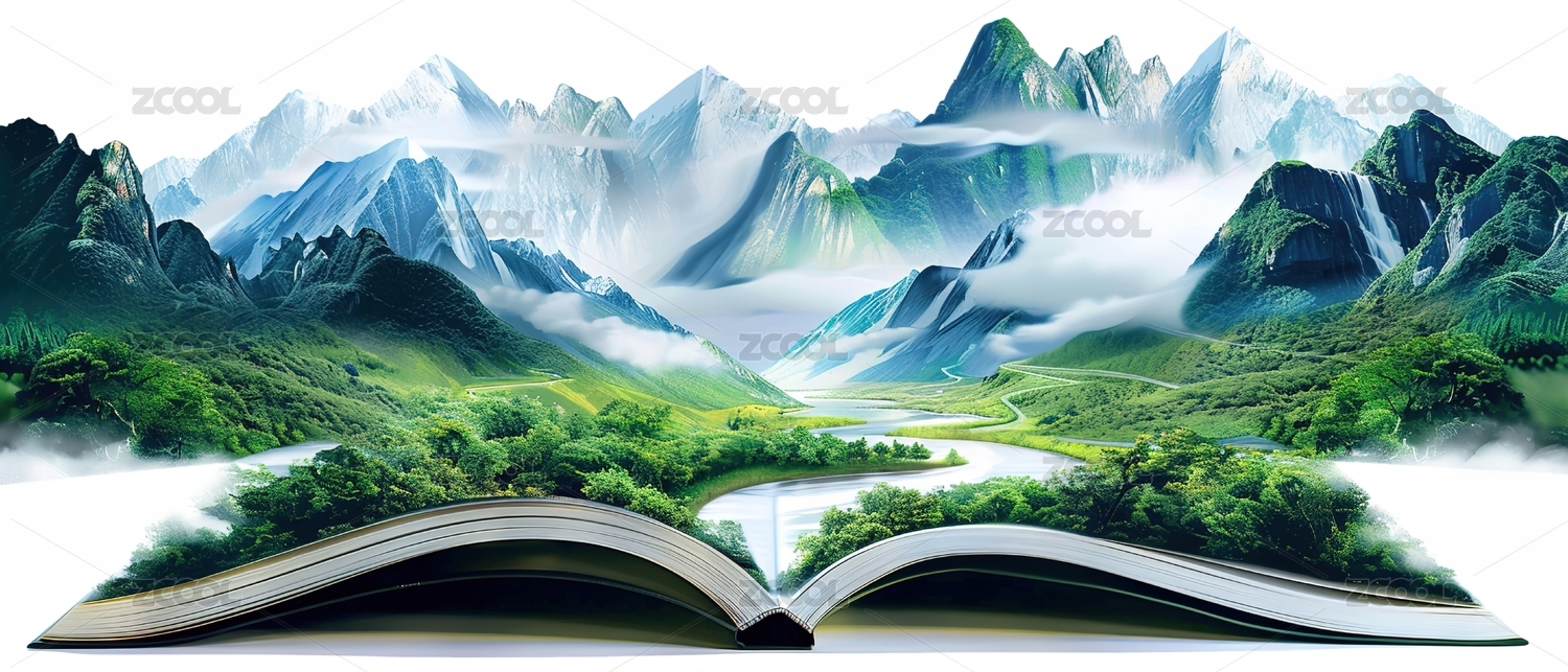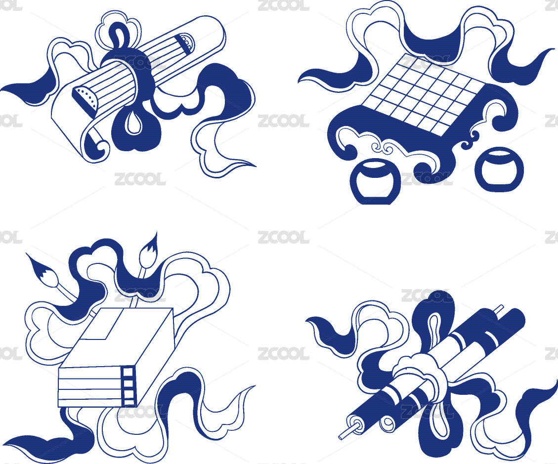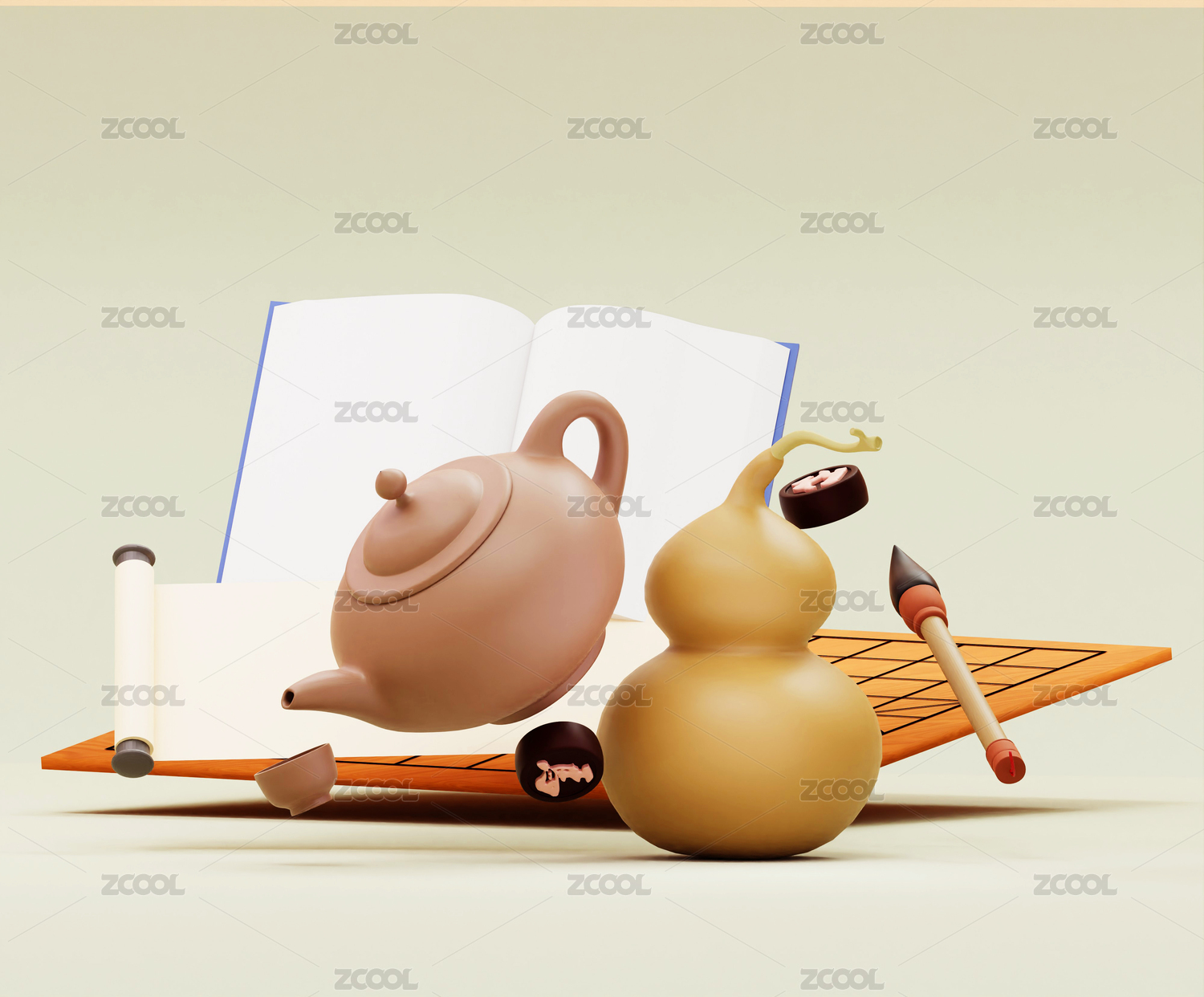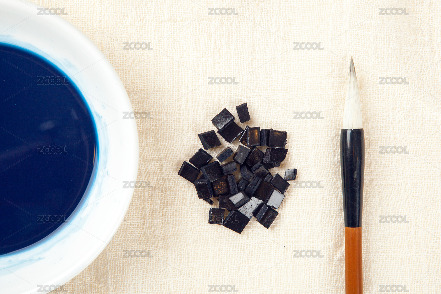 放好的毛笔和古书籍及旁边卷轴书画作品