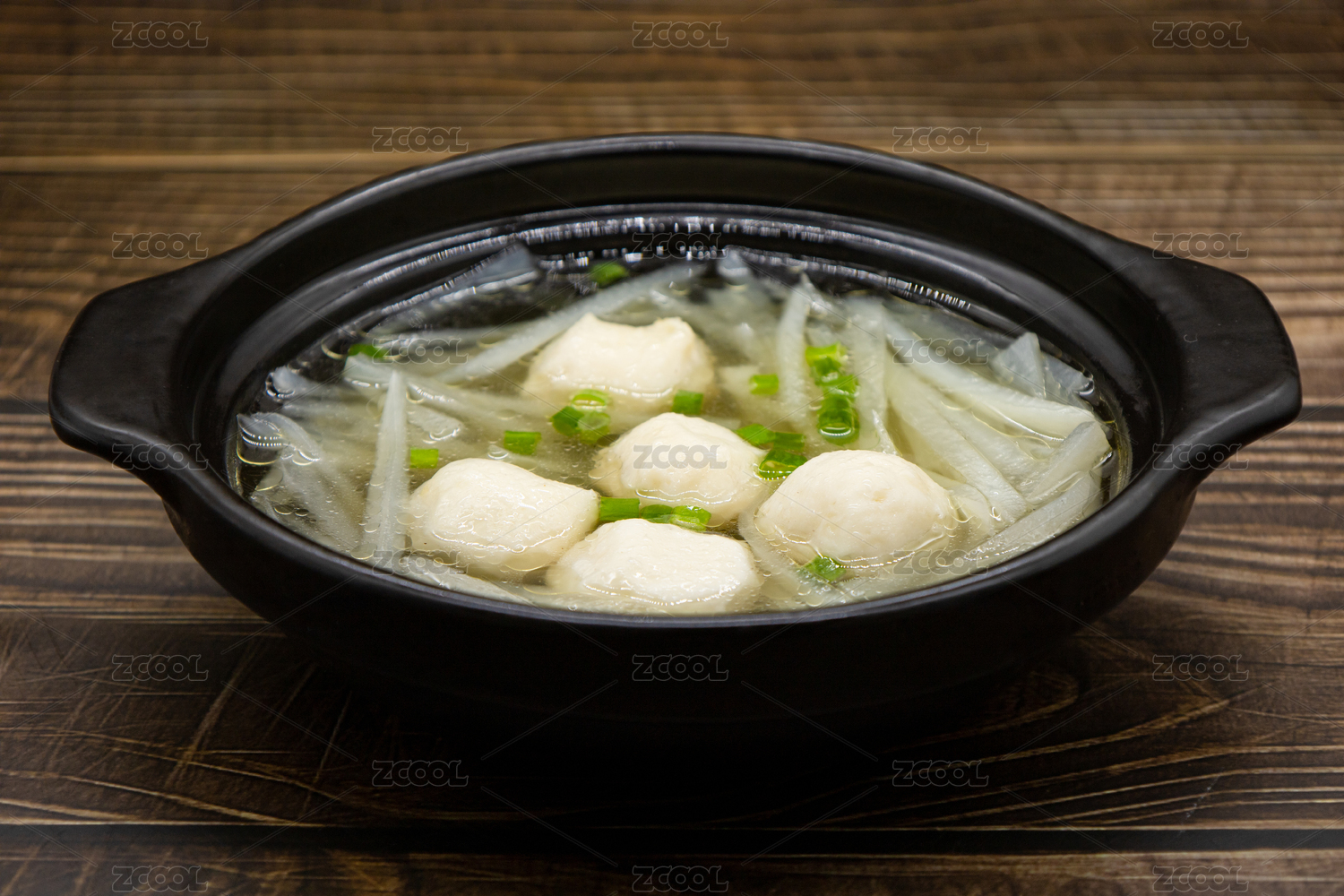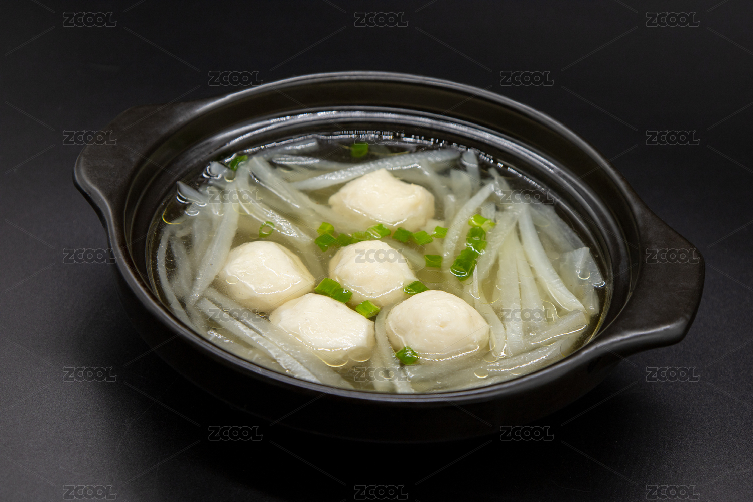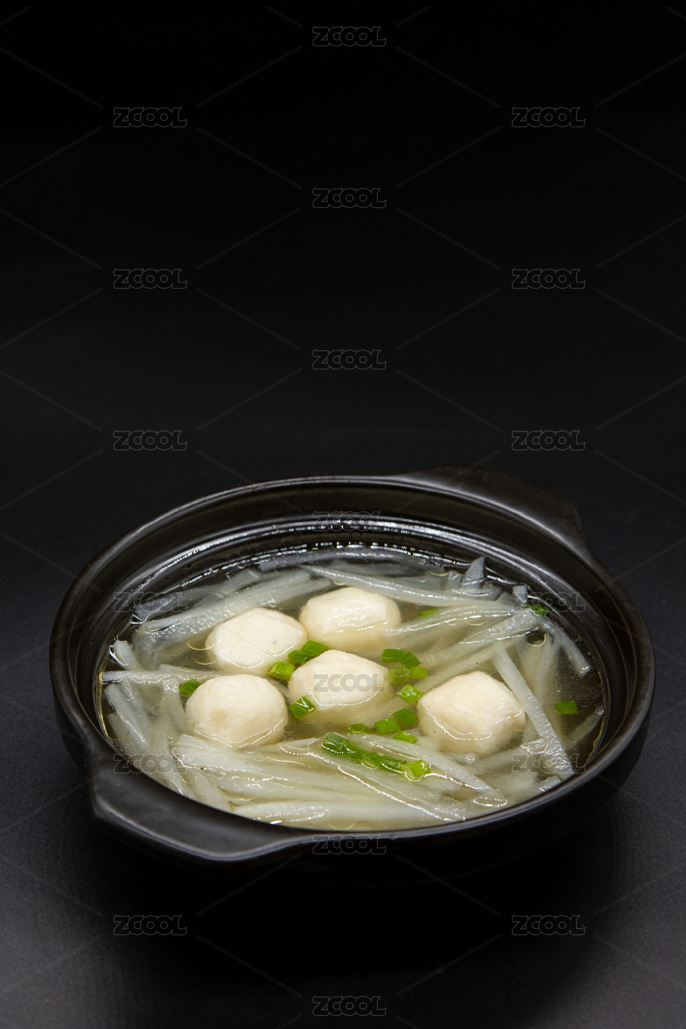 黑色背景萝卜丝鱼丸汤