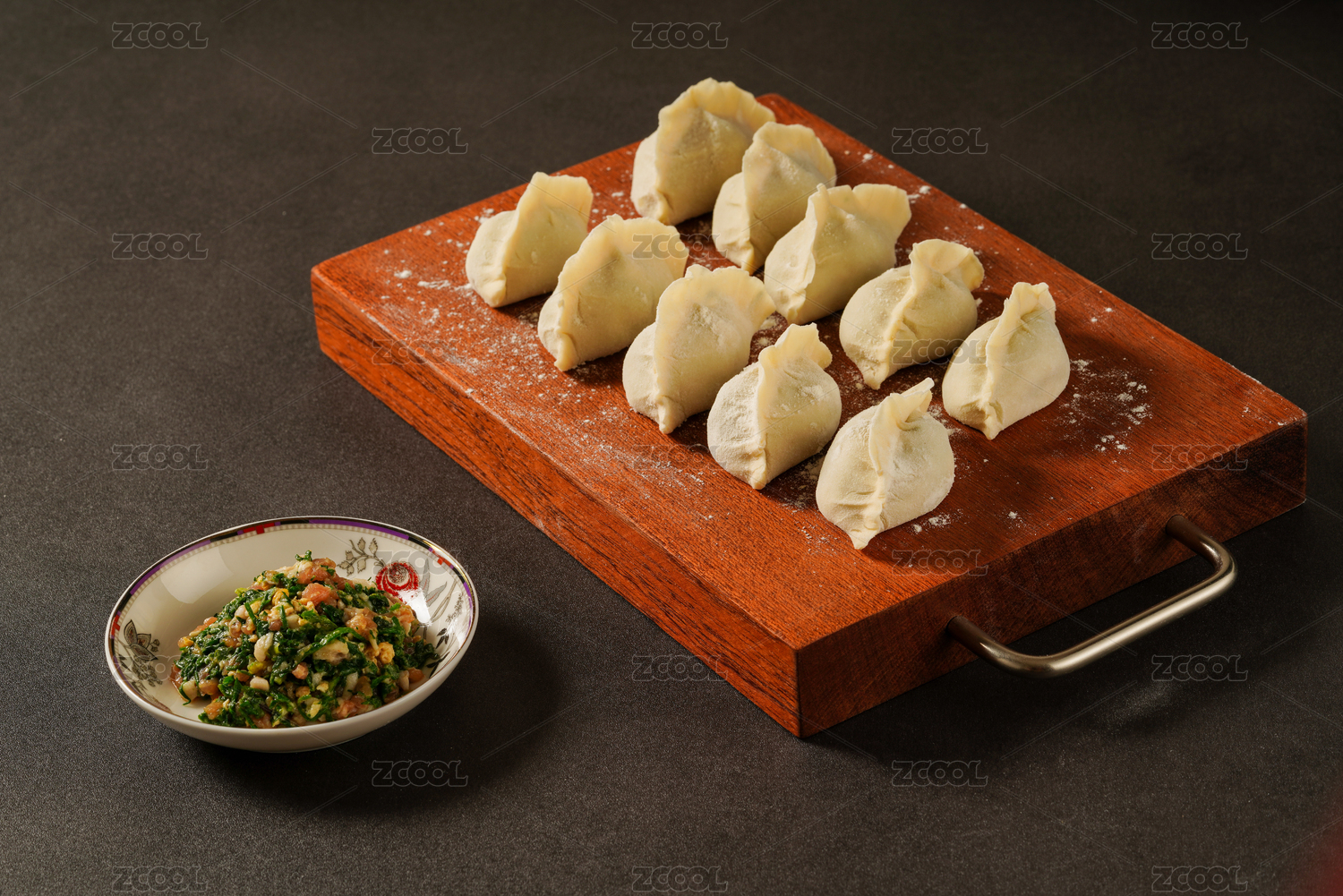 黑色背景上案板上的一堆生的水饺