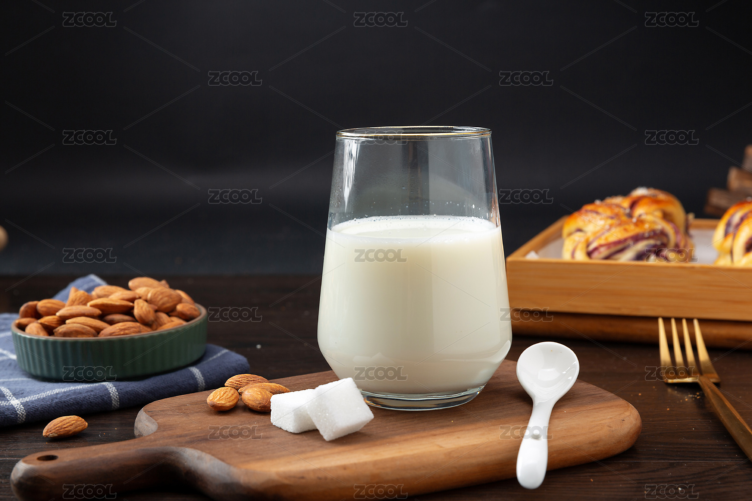 餐桌上木案板上的一杯牛奶
