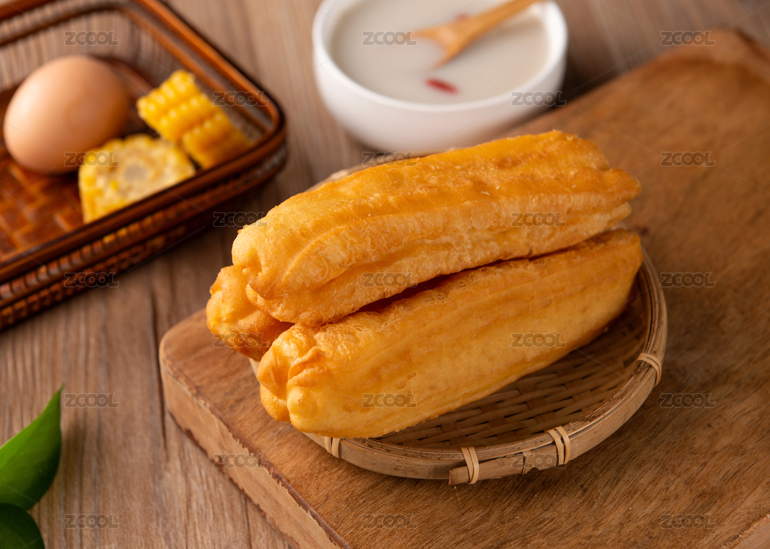 案板上竹筐中摆放的切开的油条