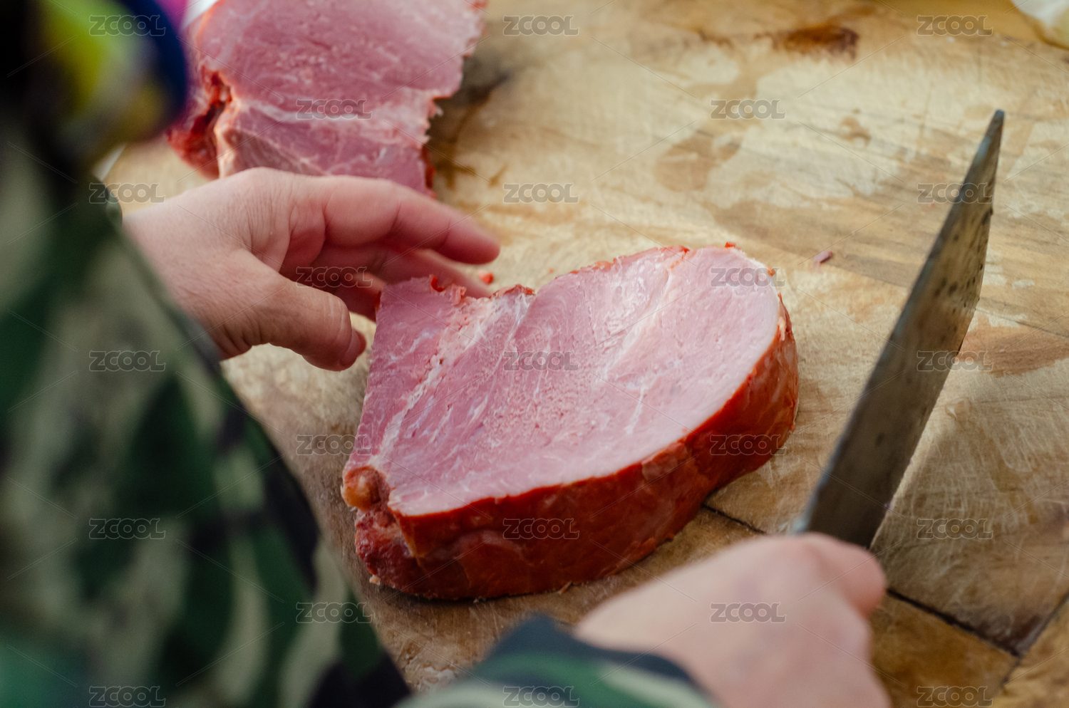 在案板上切肉的摊主