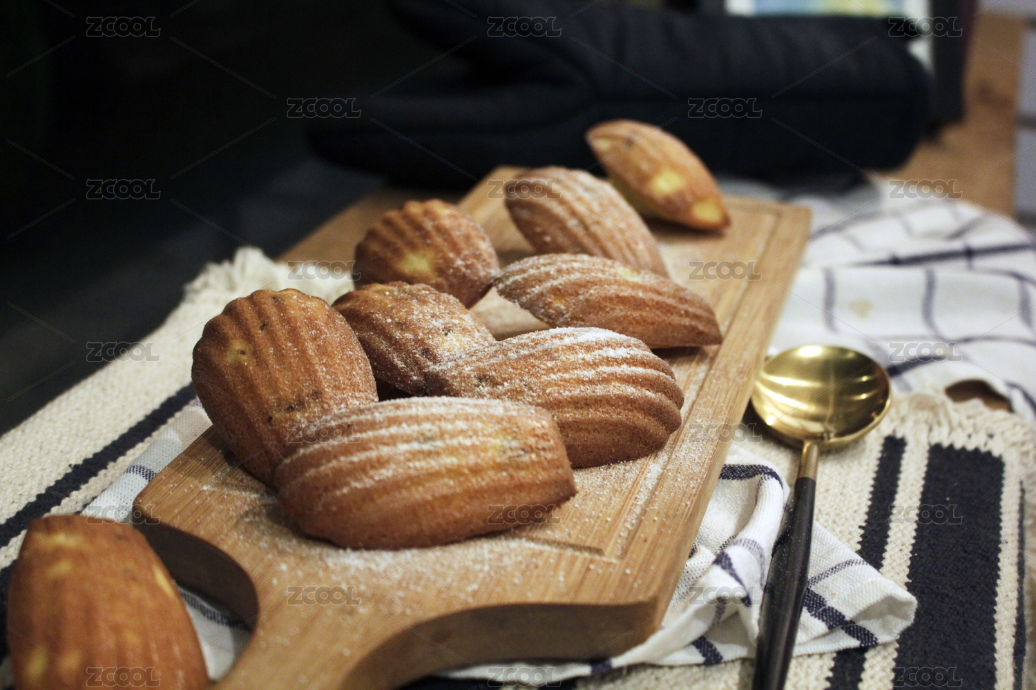 木头案板上撒了糖粉的玛德琳蛋糕