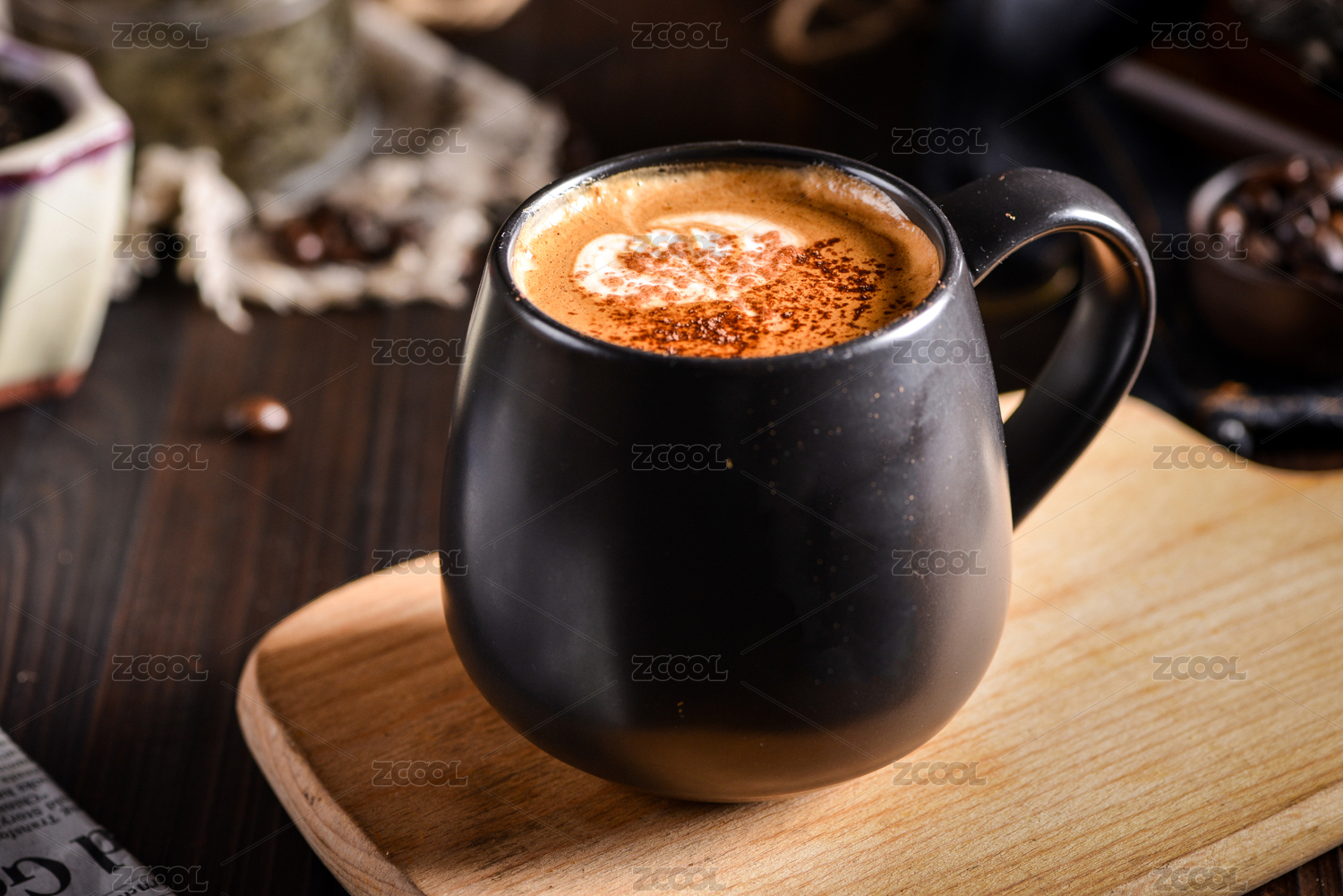 一杯提拉米苏放在木质案板上
