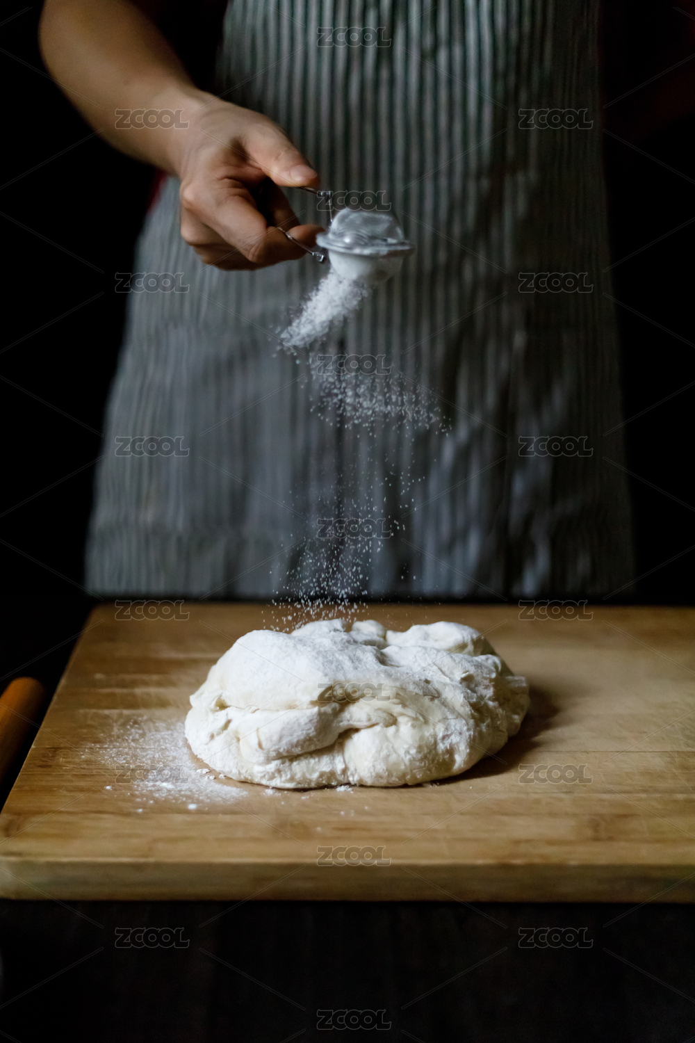正在对放在木案板上的面团撒粉