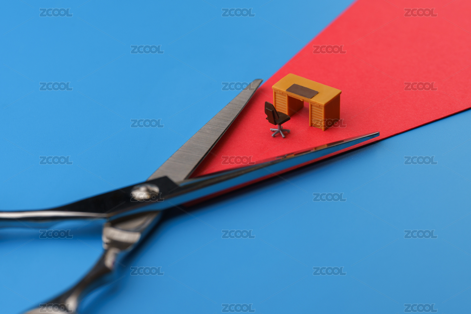 蓝色背景下站在剪刀旁等待裁员的人群微缩创