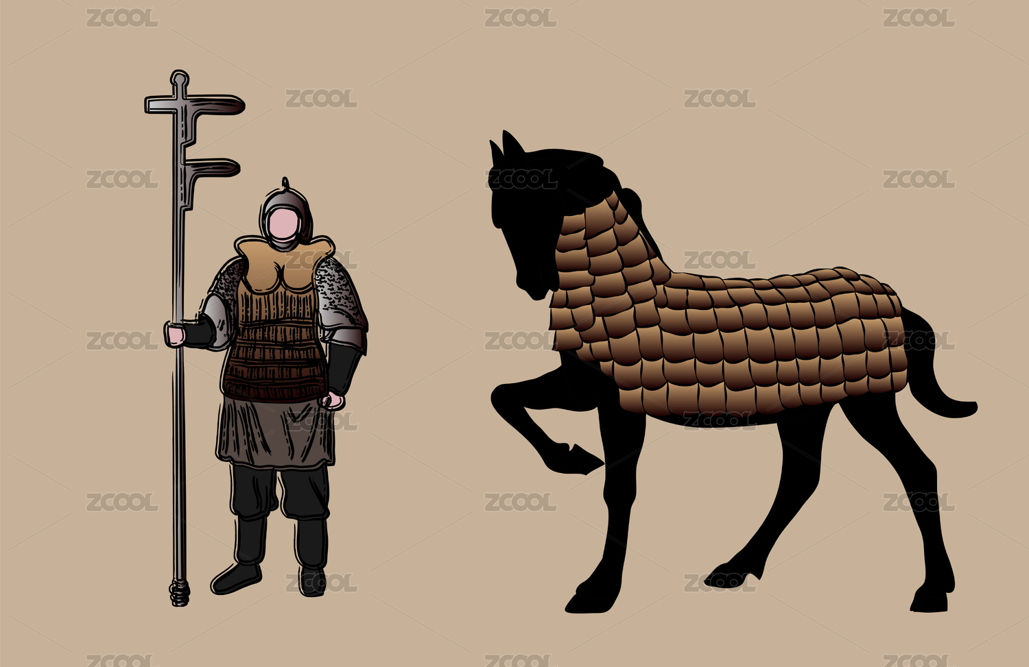 古风锁子甲战马持戈盔甲武士矢量手绘插画