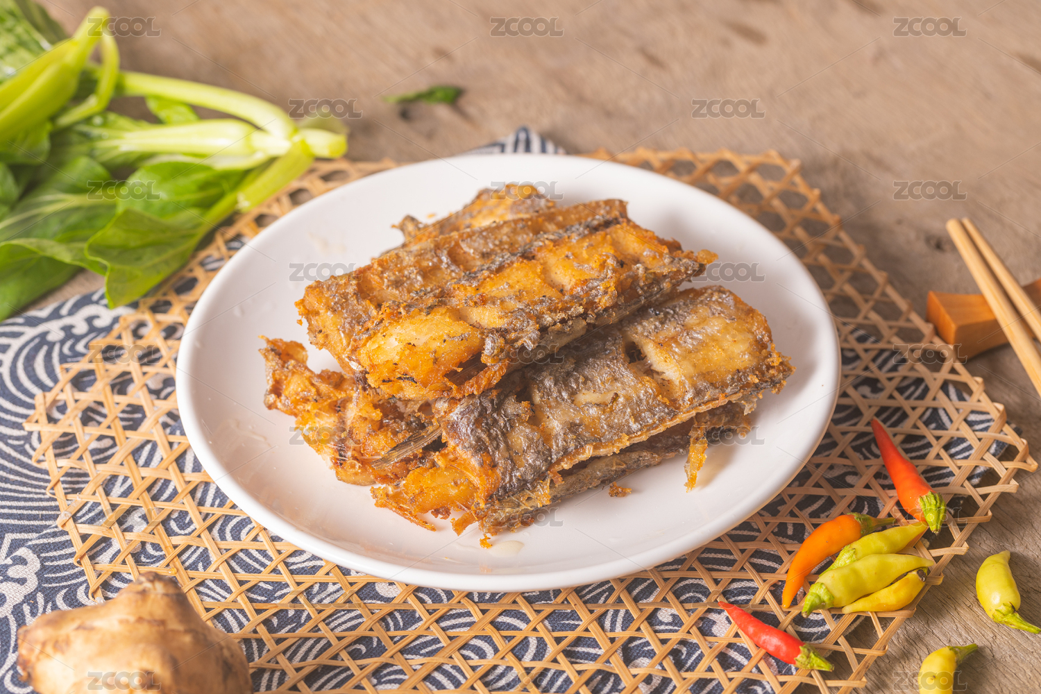 木桌上装在白色盘子中的香煎带鱼段