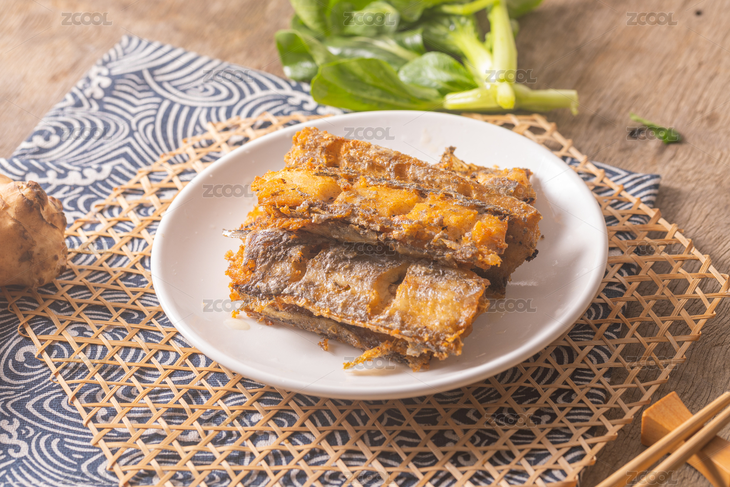 木桌上装在盘子中的香煎带鱼段