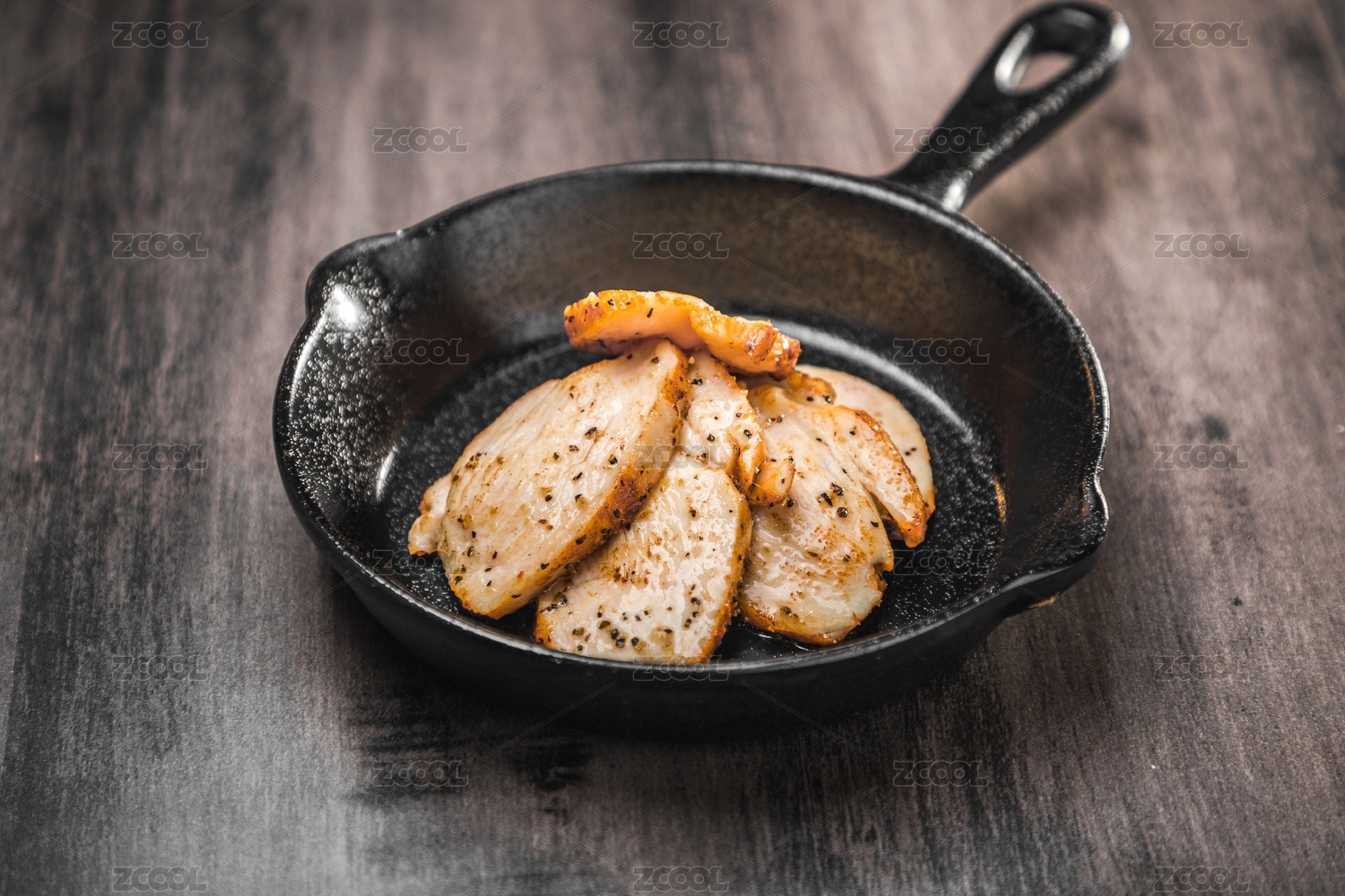 暗色木纹桌上放着一盘胡椒煎鸡胸肉片