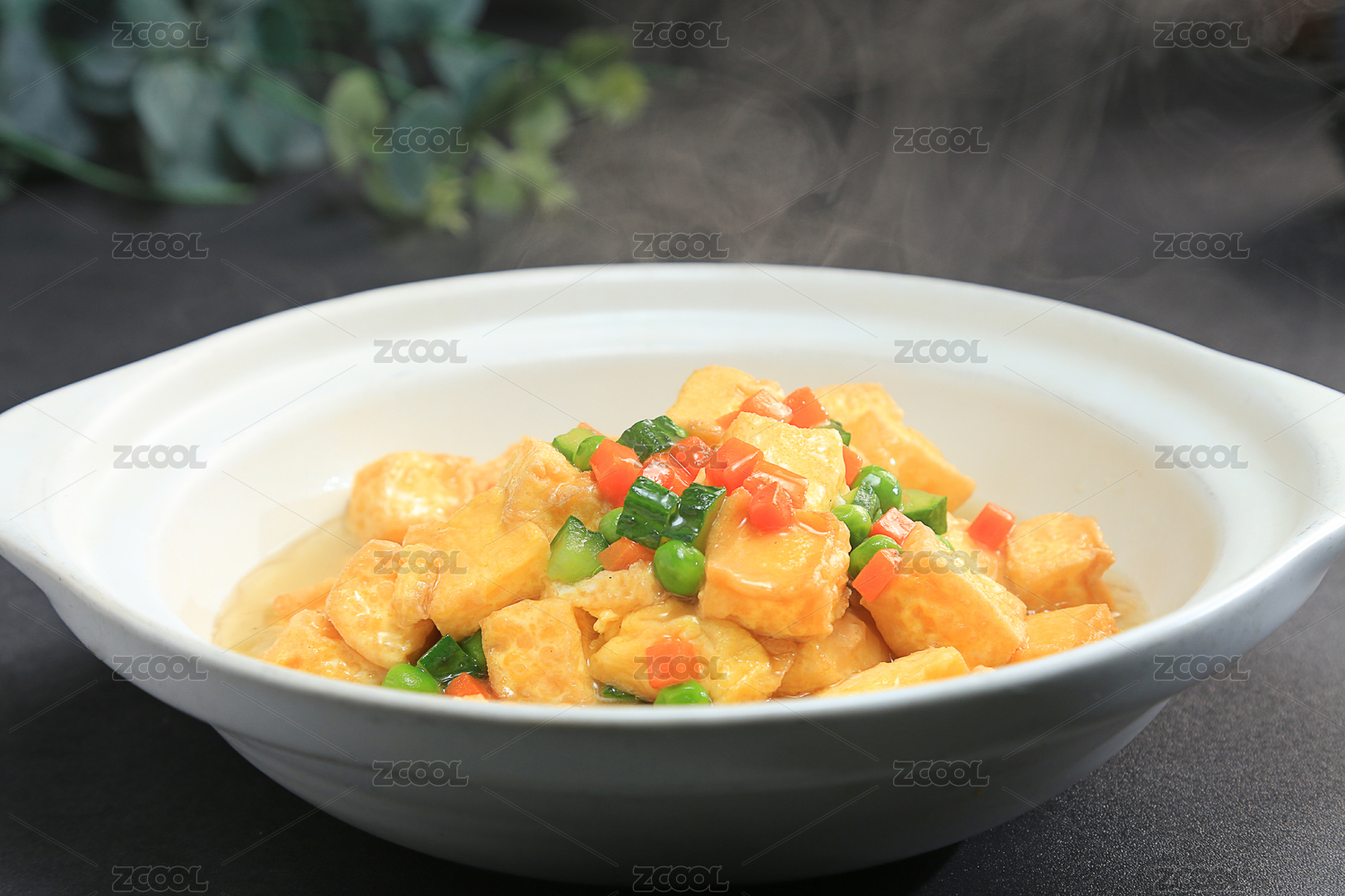 深色背景上白色汤锅里的香煎豆腐块