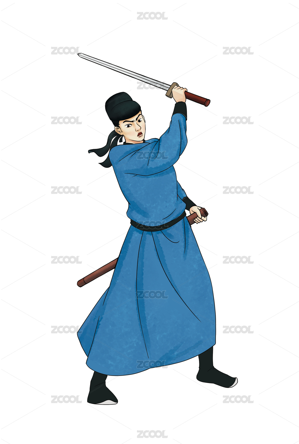 一个穿着古装的男子举着一把宝剑