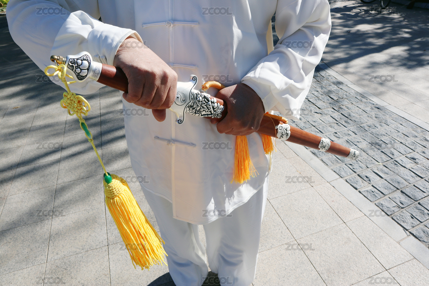 公园里穿着唐装手拿宝剑特写