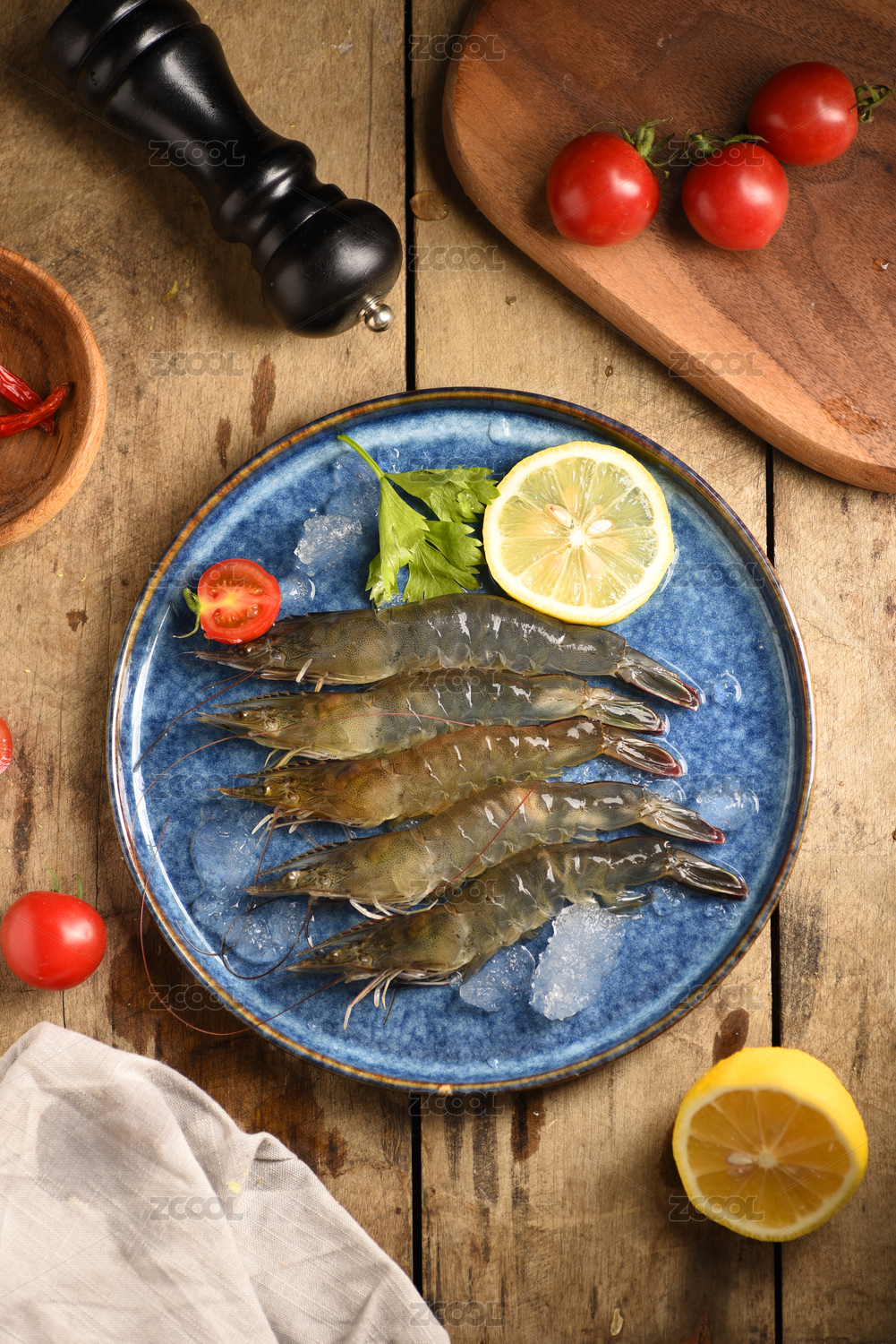 木纹桌子上盘子里的大虾的俯视图
