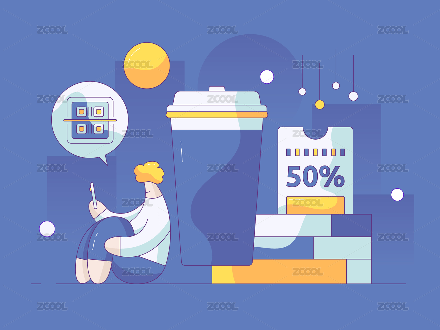 扫码领券关注五折优惠咖啡运营插画
