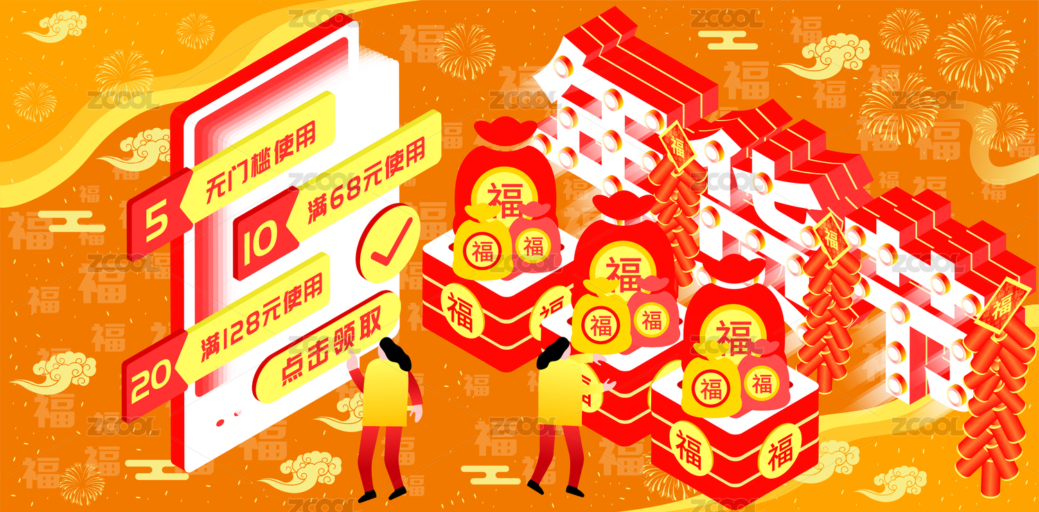 金色喜气年货节领券2.5D矢量插画