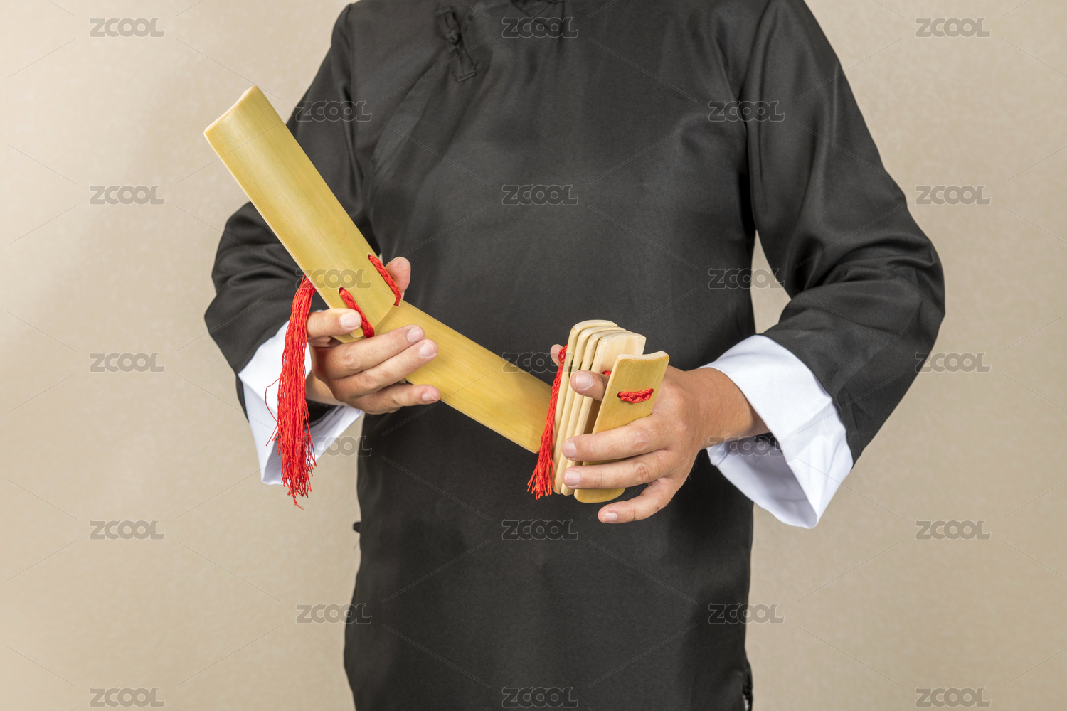 身穿大褂的曲艺演员正在演奏快板书特写