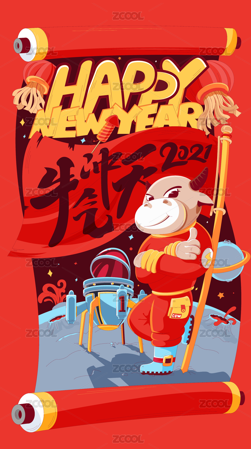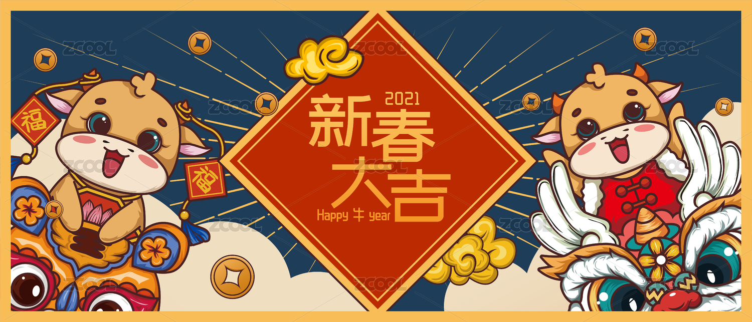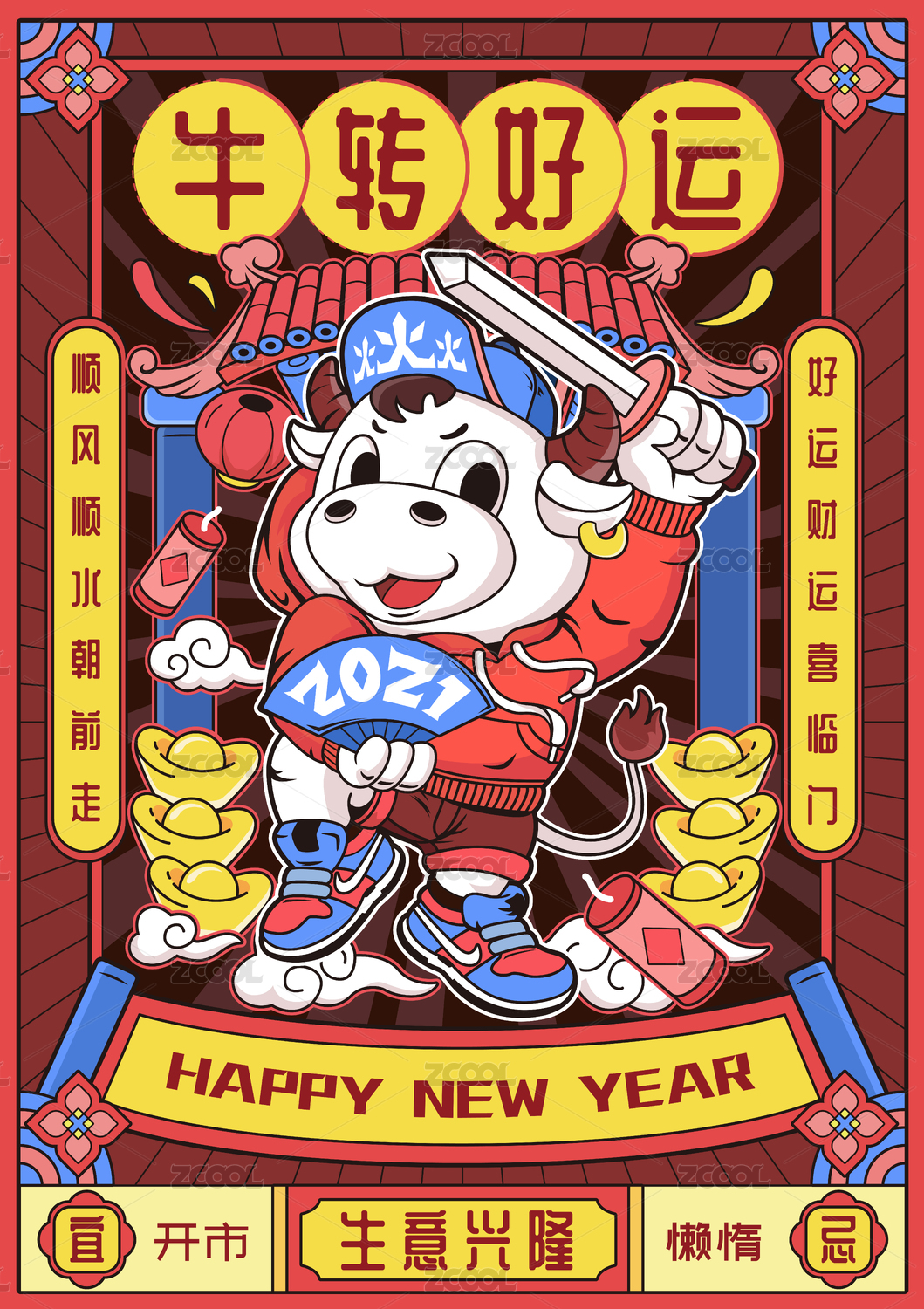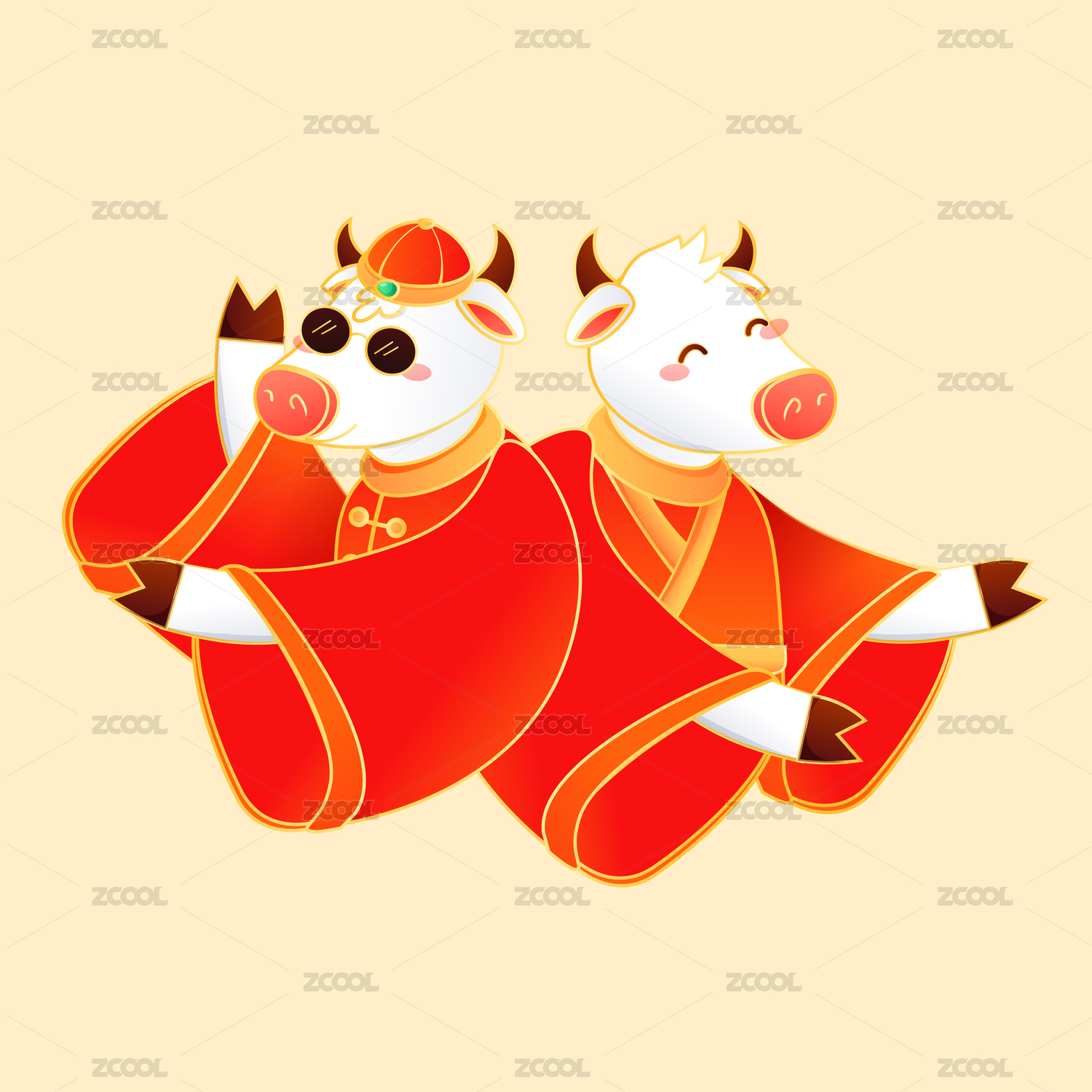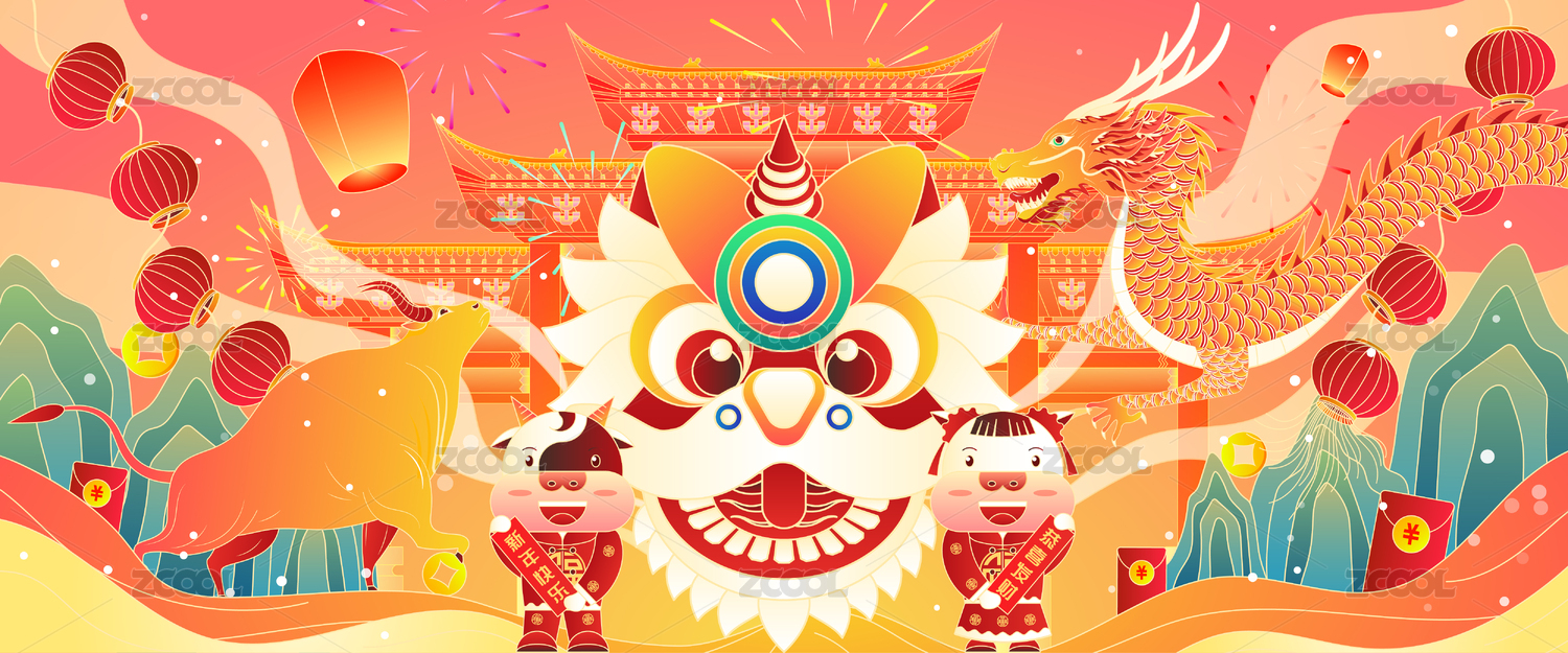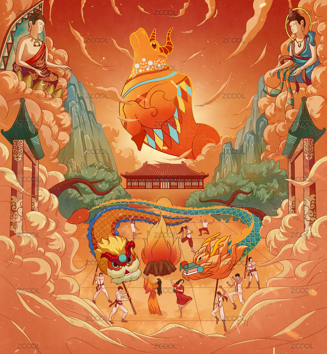 牛年节日插画手绘传统国风习俗文化国潮春节