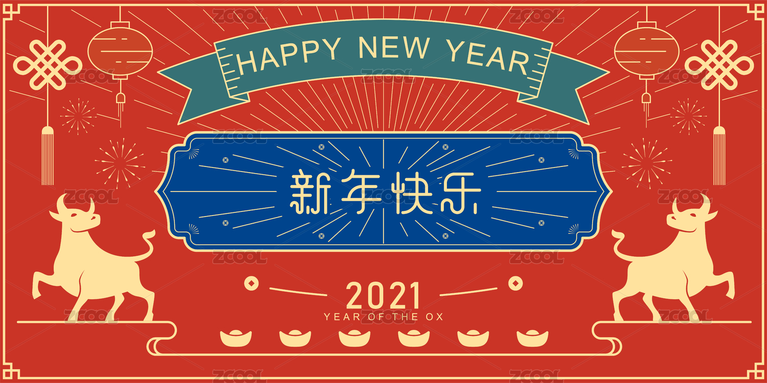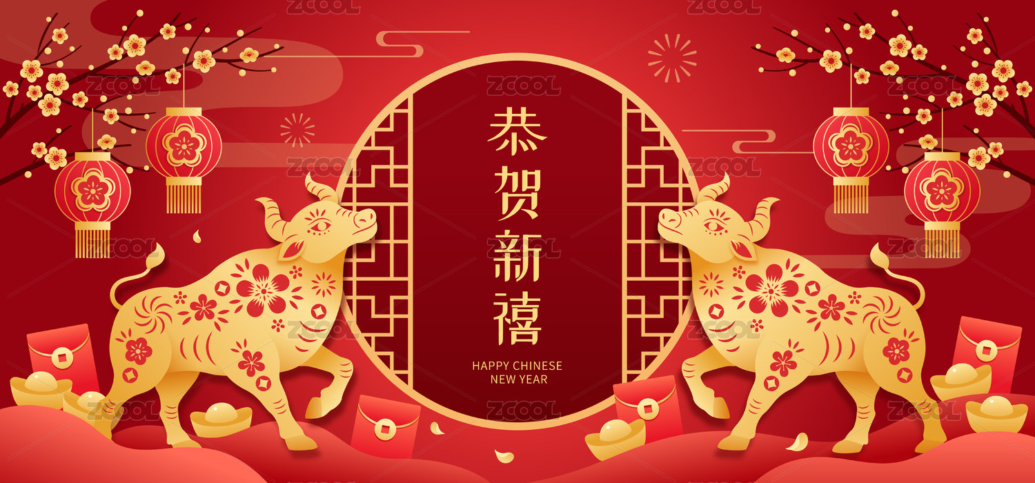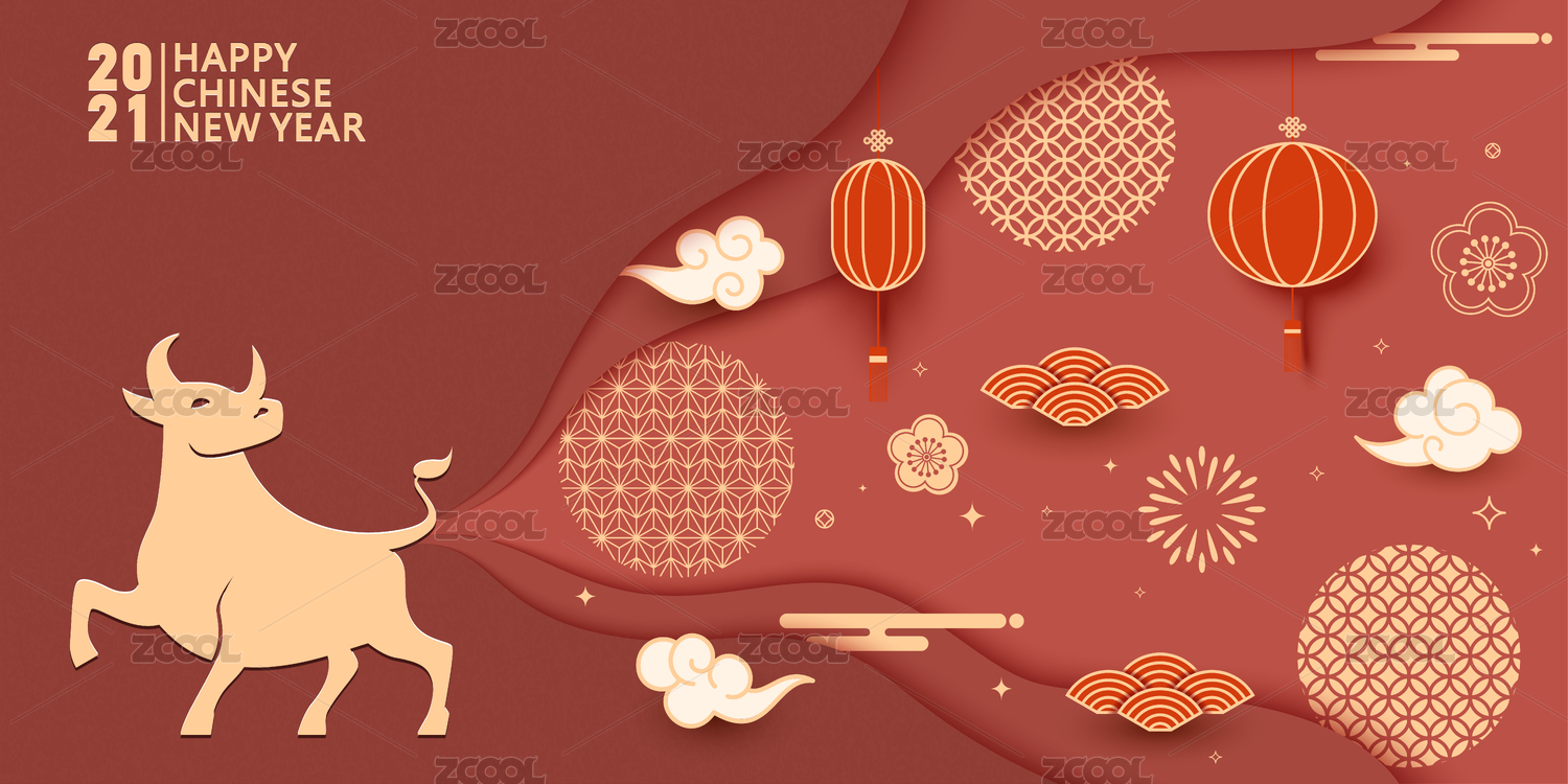 牛年矢量插画,红灯笼和中国传统纹理图案