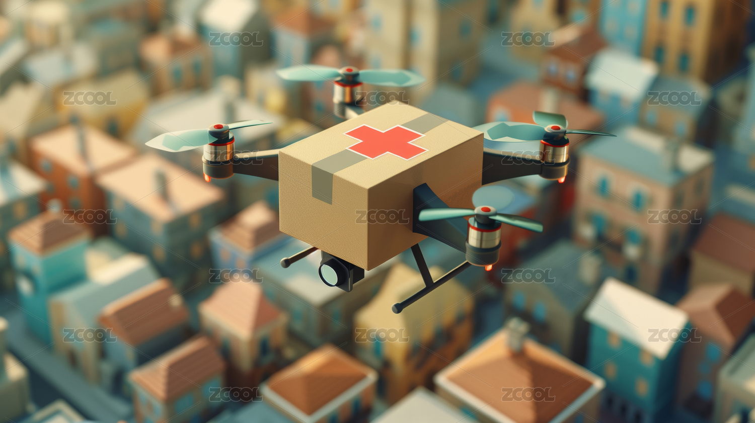 3d卡通的智能救援无人机飞在城市上空