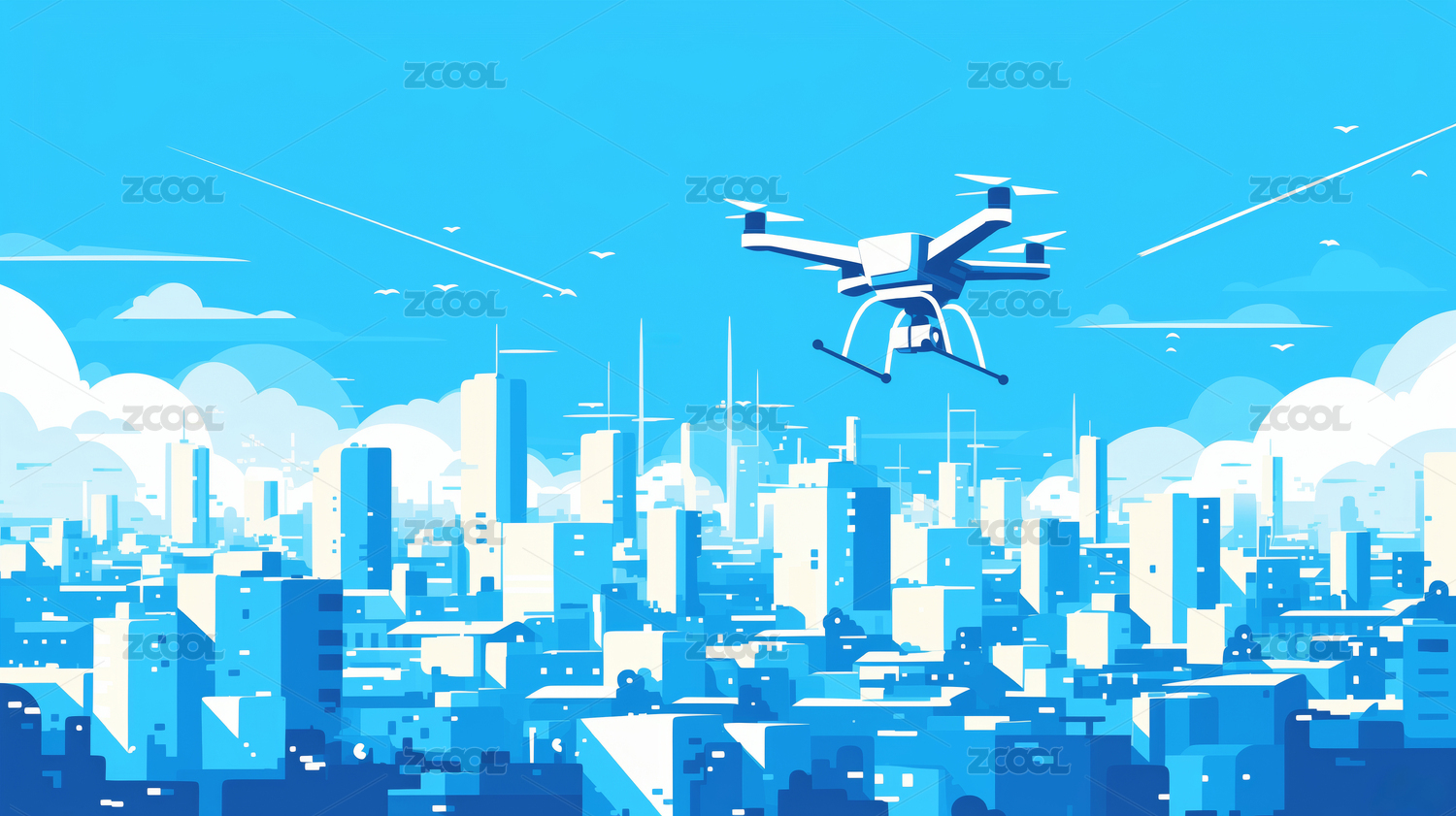 无人机飞行在城市上空的插画