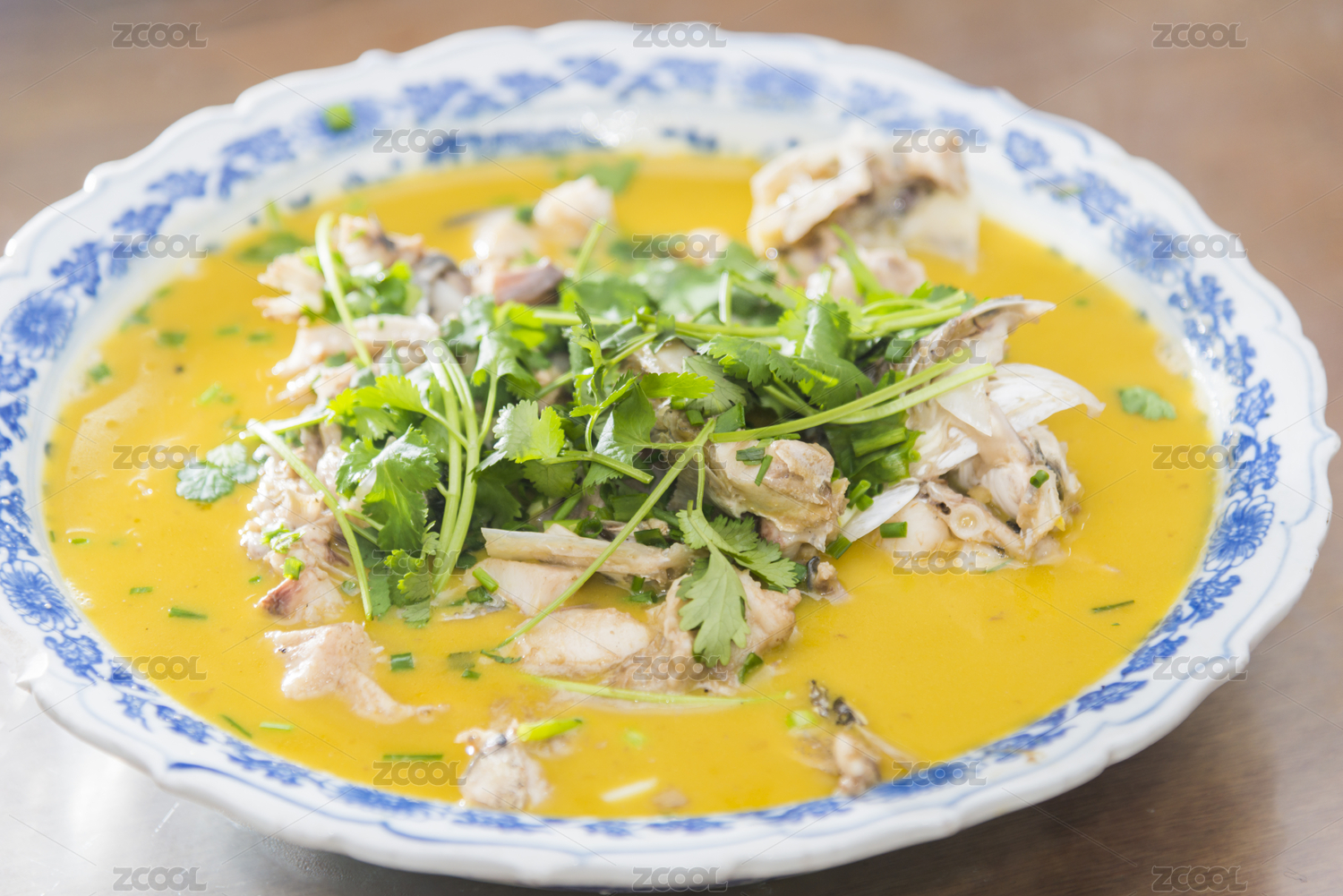 蓝色餐布上的一盆云南酸汤鱼