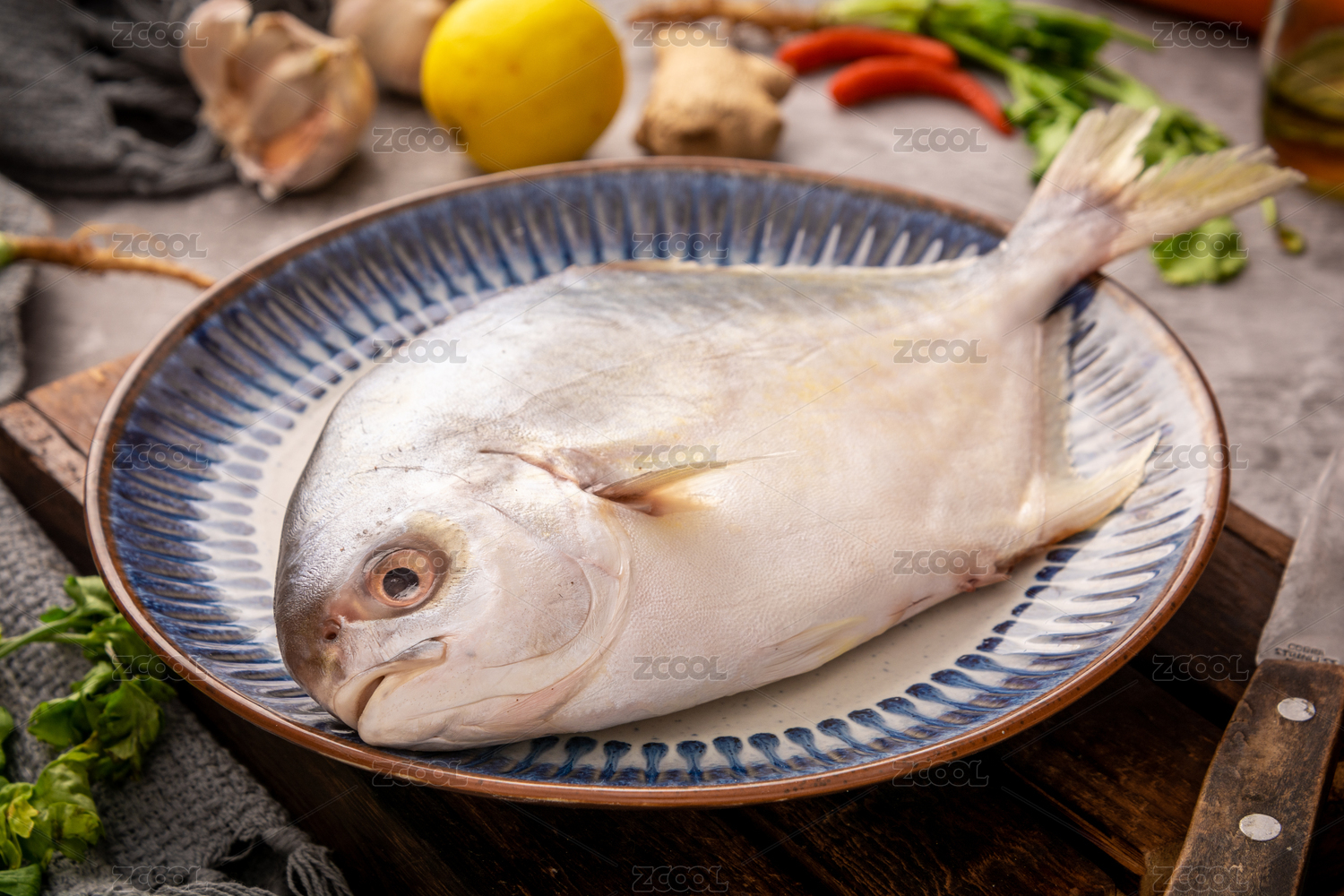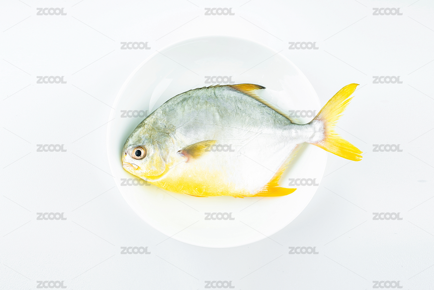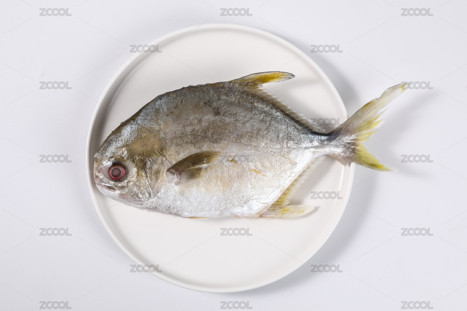 白背景上菜碟里一条新鲜海鱼金鲳鱼